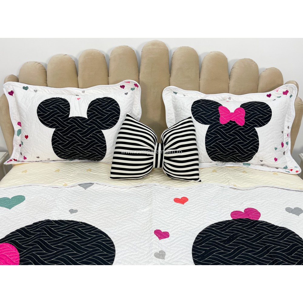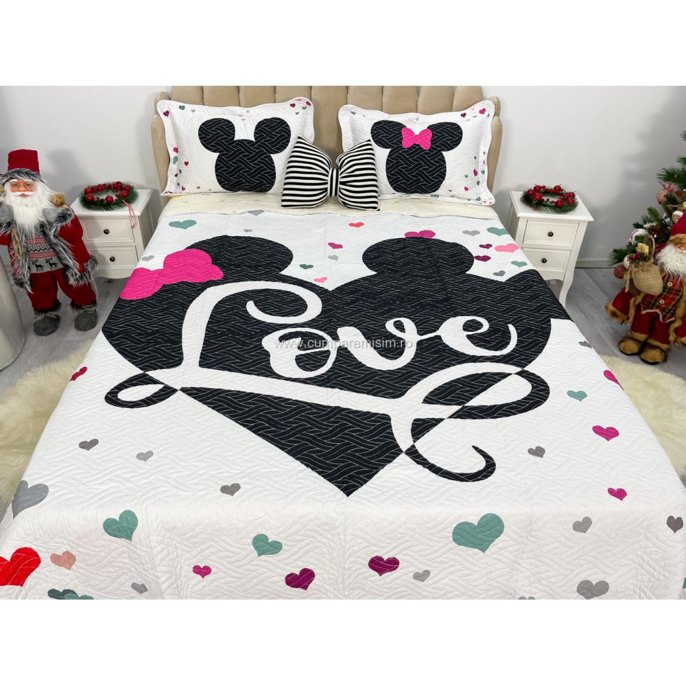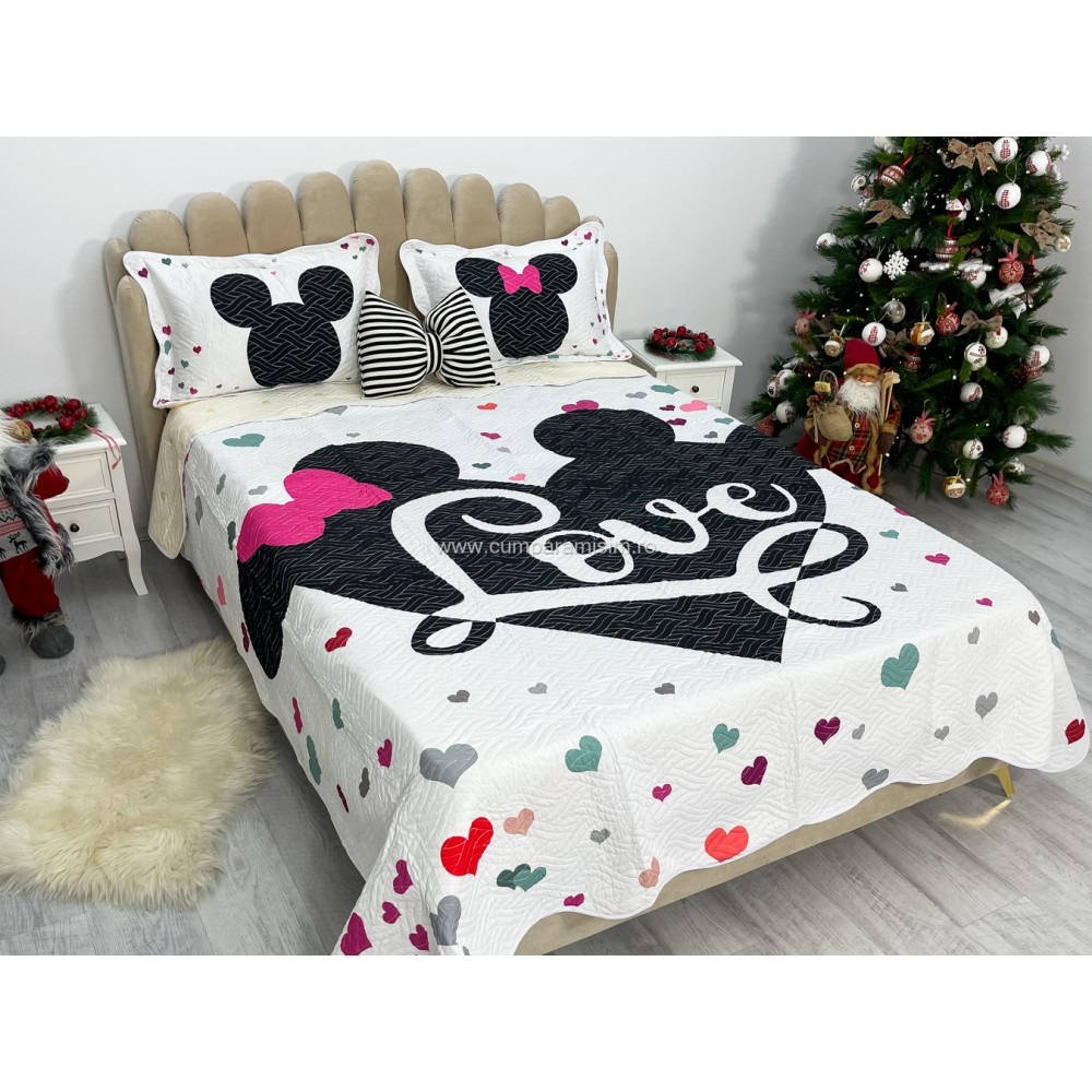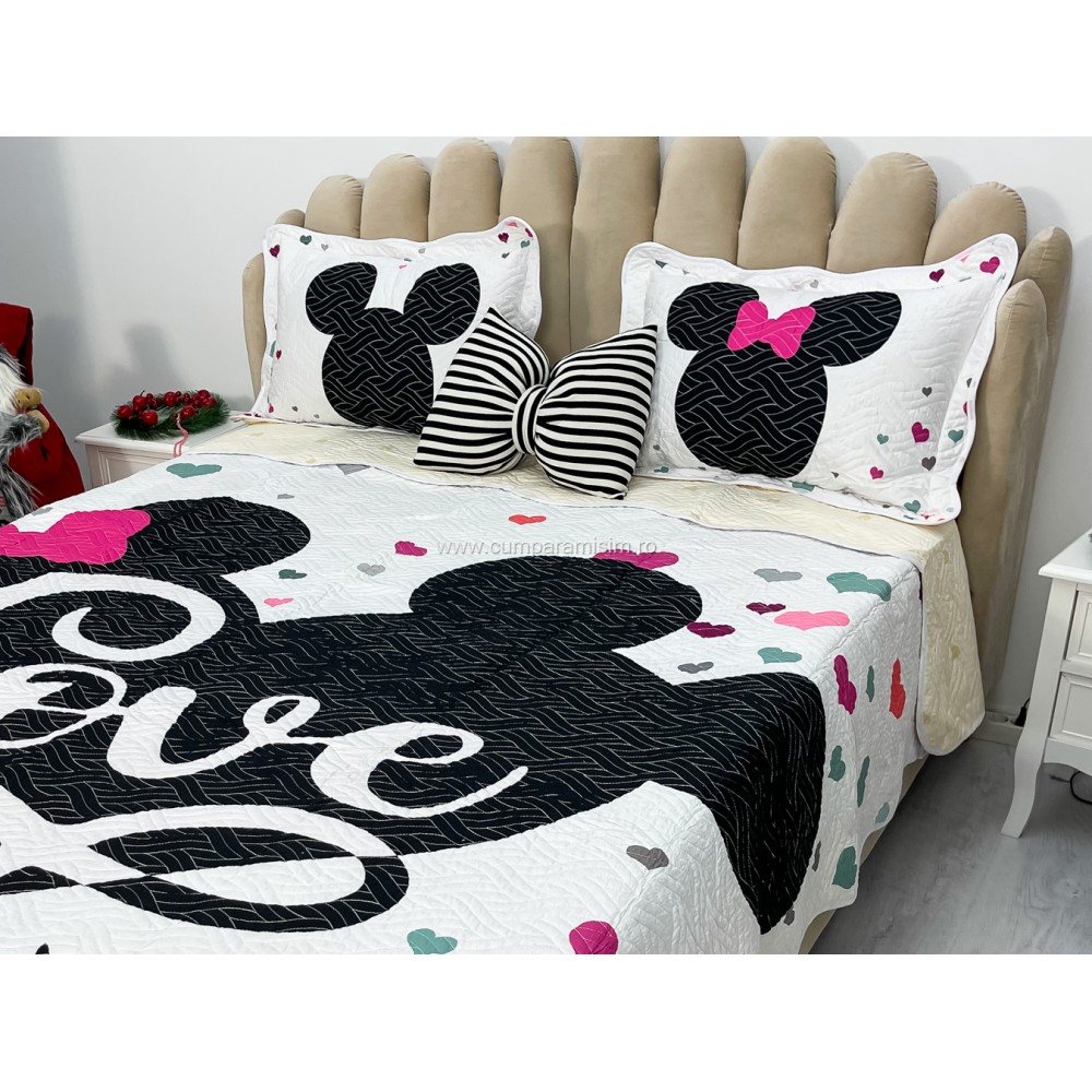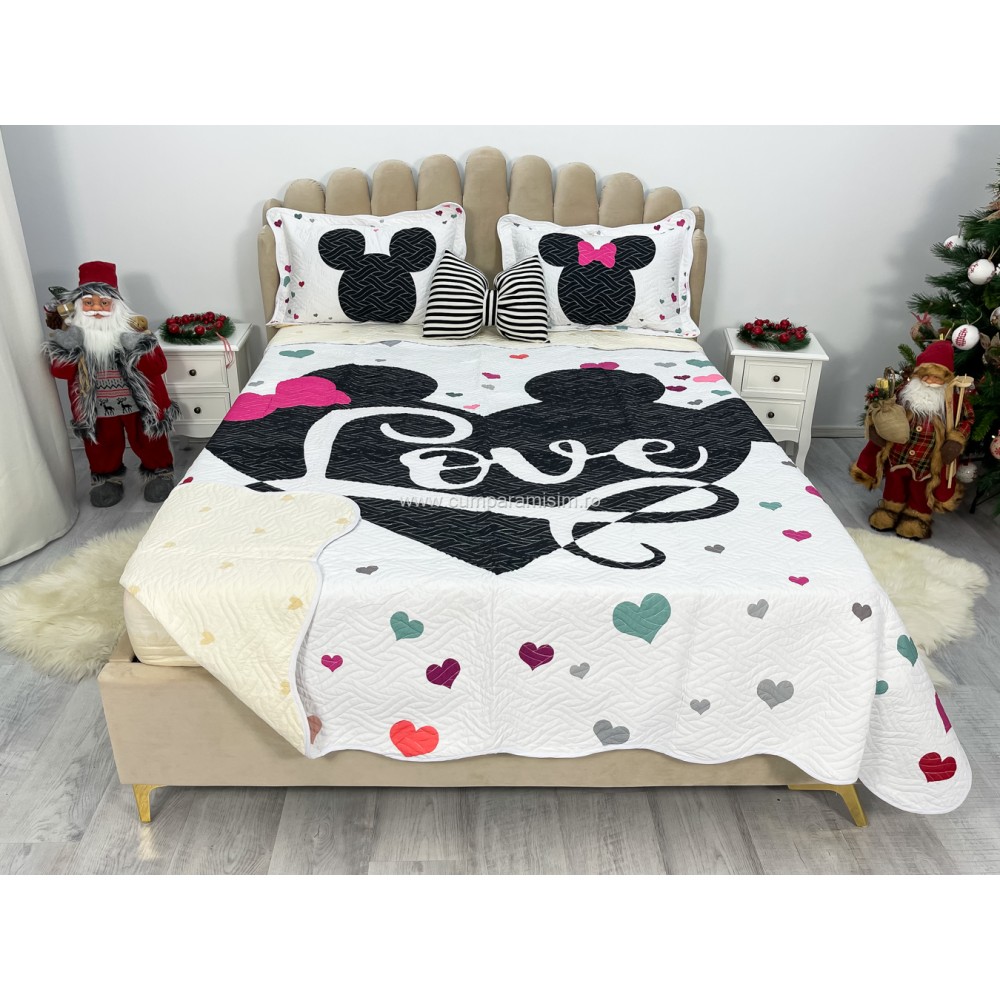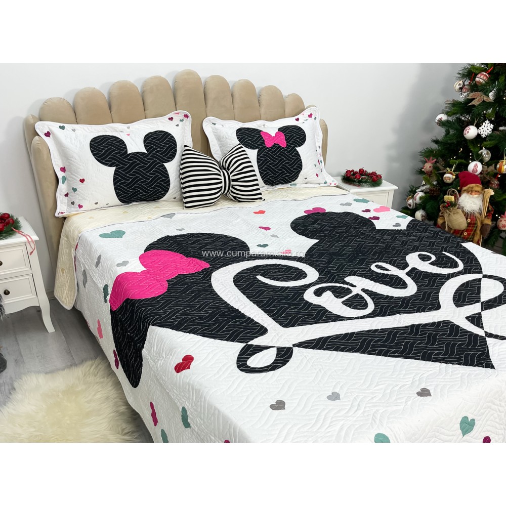 Cuvertura pat dublu, din bumbac tip finet, Identica cu Poza, 3 PIESE, Alb, Mickey&Minnie Mouse, inimioare, Disney, cod produs: CVP235