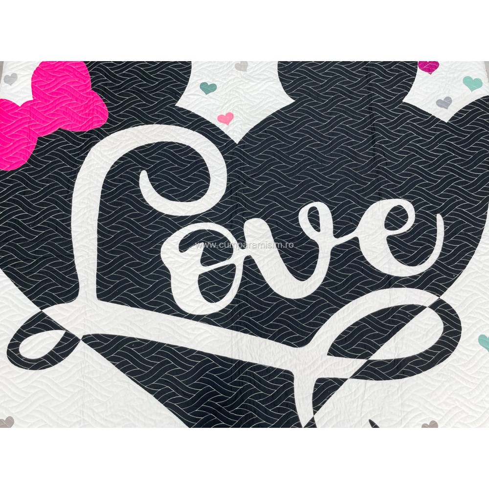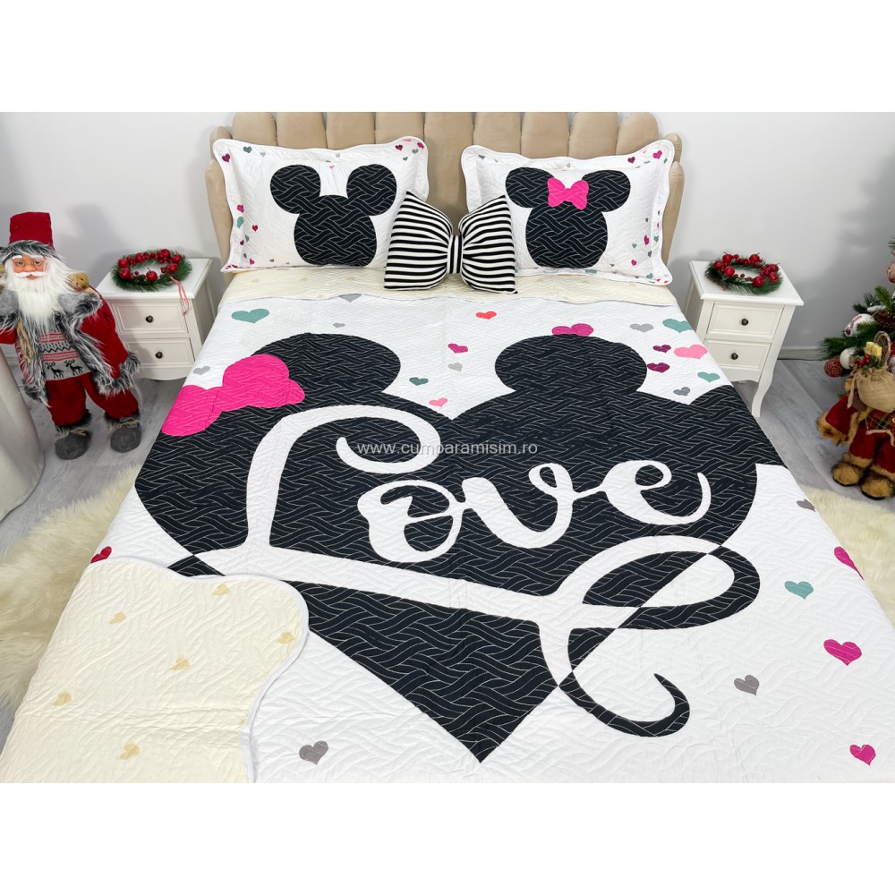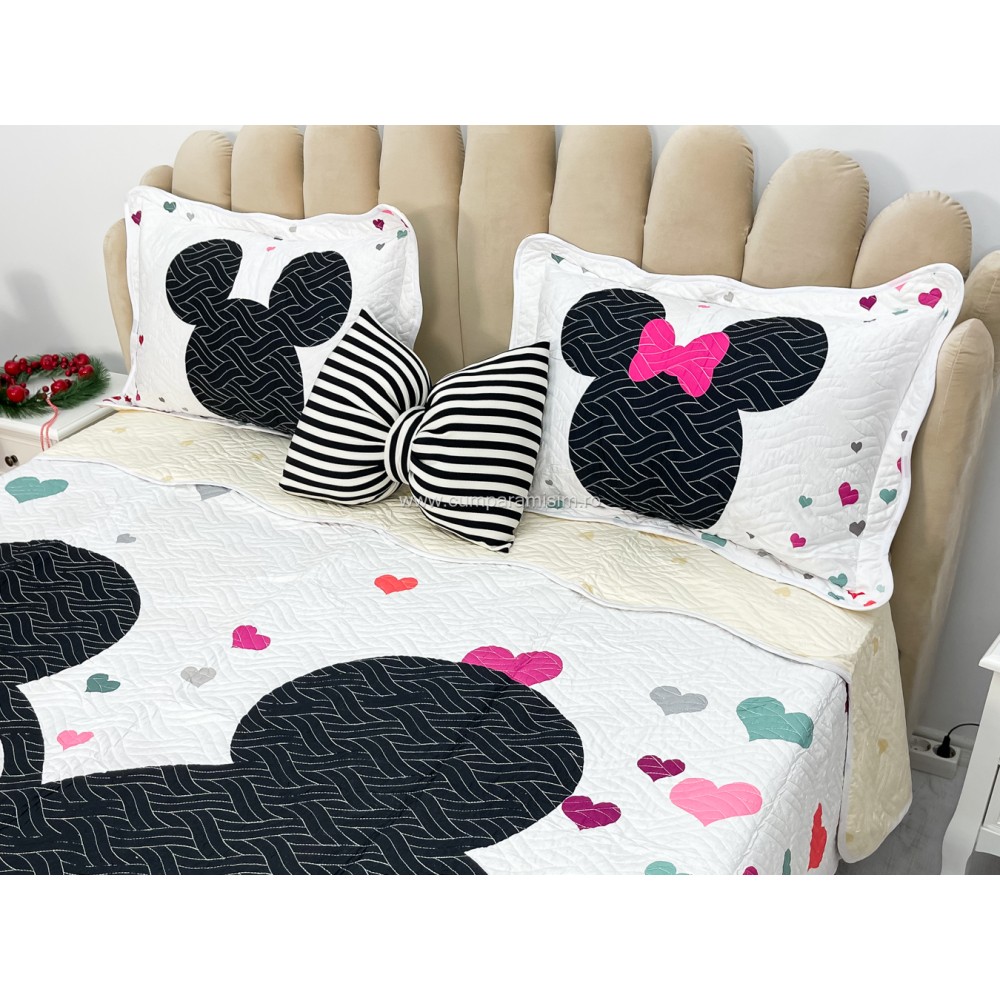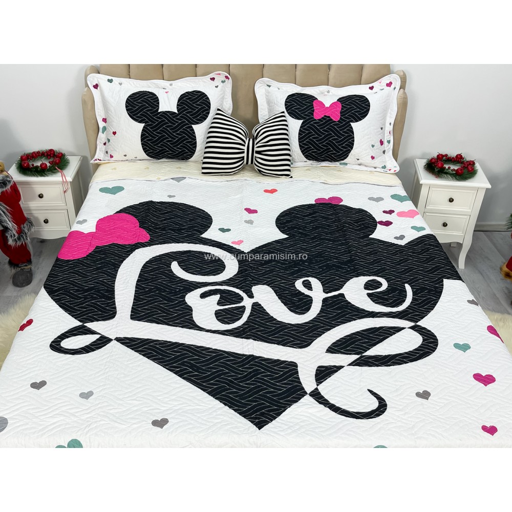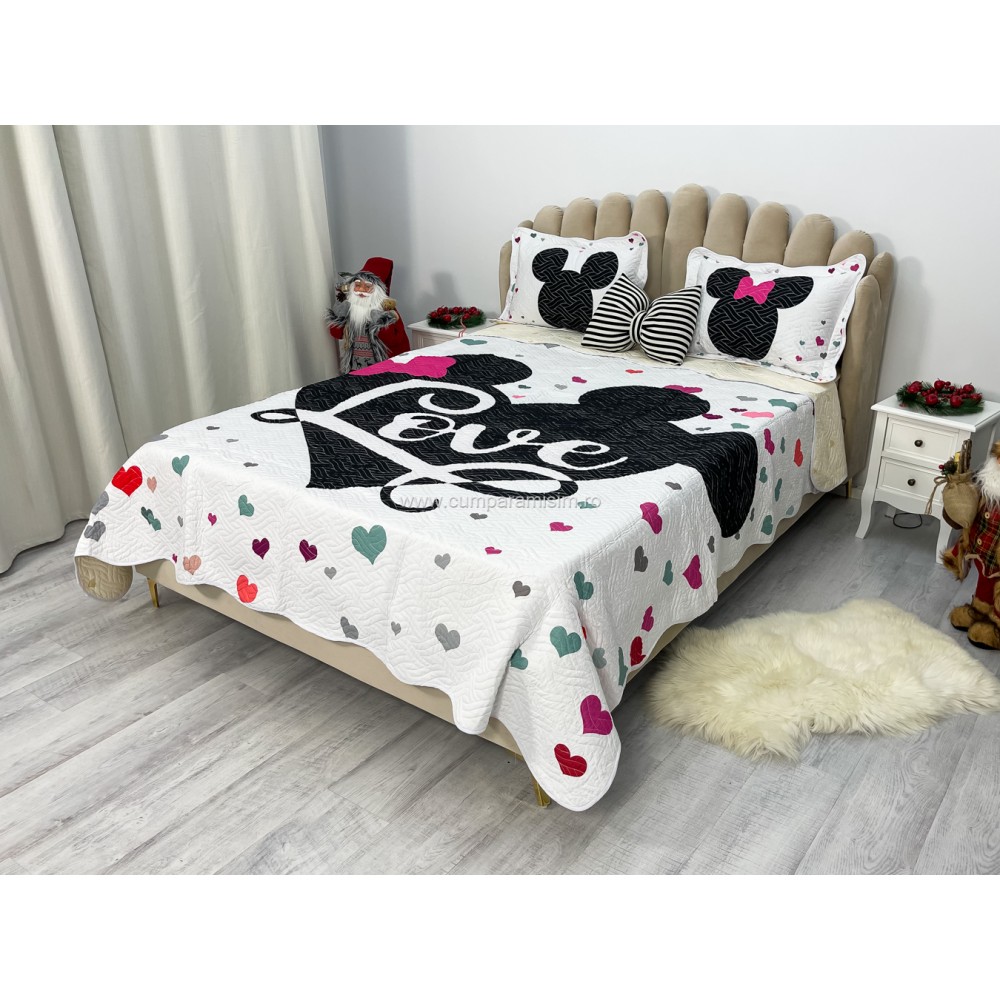 Cuvertura pat dublu, din bumbac tip finet, Identica cu Poza, 3 PIESE, Alb, Mickey&Minnie Mouse, inimioare, Disney, cod produs: CVP235