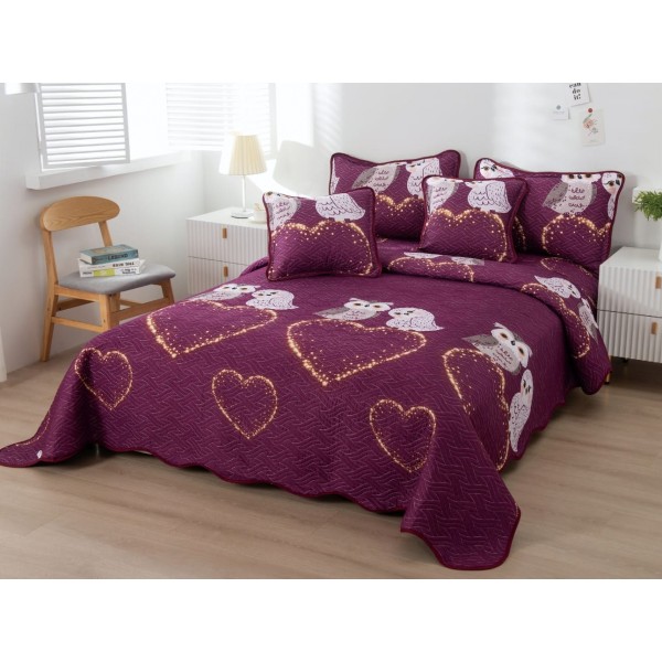 Cuvertura pat dublu din Bumbac Finet, 5 PIESE, Visiniu, bufnite, inimioare, Alti producatori, cod produs: CVP309