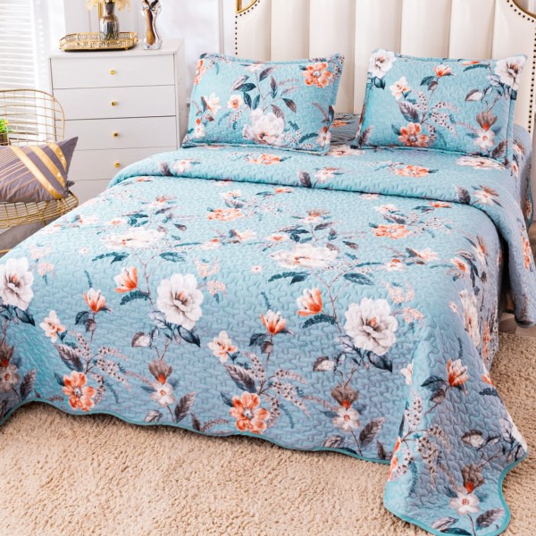 Cuvertura pat dublu, matlasata, din Catifea, 3 piese, 230x250cm, Bleu, flori, Alti producatori, cod produs: CVP604