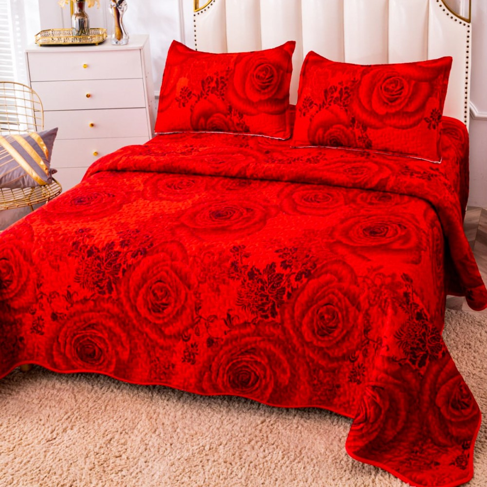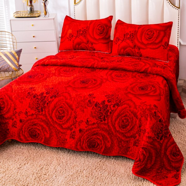 Cuvertura pat dublu, matlasata, din Catifea, 3 piese, 230x250cm, Rosu, trandafiri, Alti producatori, cod produs: CVP608