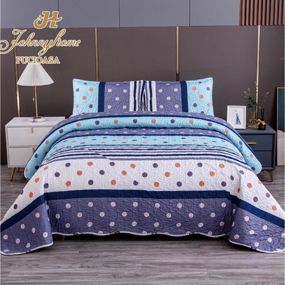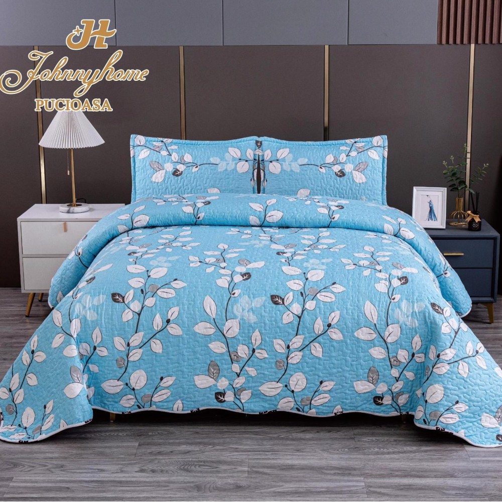 Cuvertura pentru pat dublu cu 2 fete, matlasata, Albastru, buline, frunze, Johny Home Pucioasa, cod produs: SPR-V25