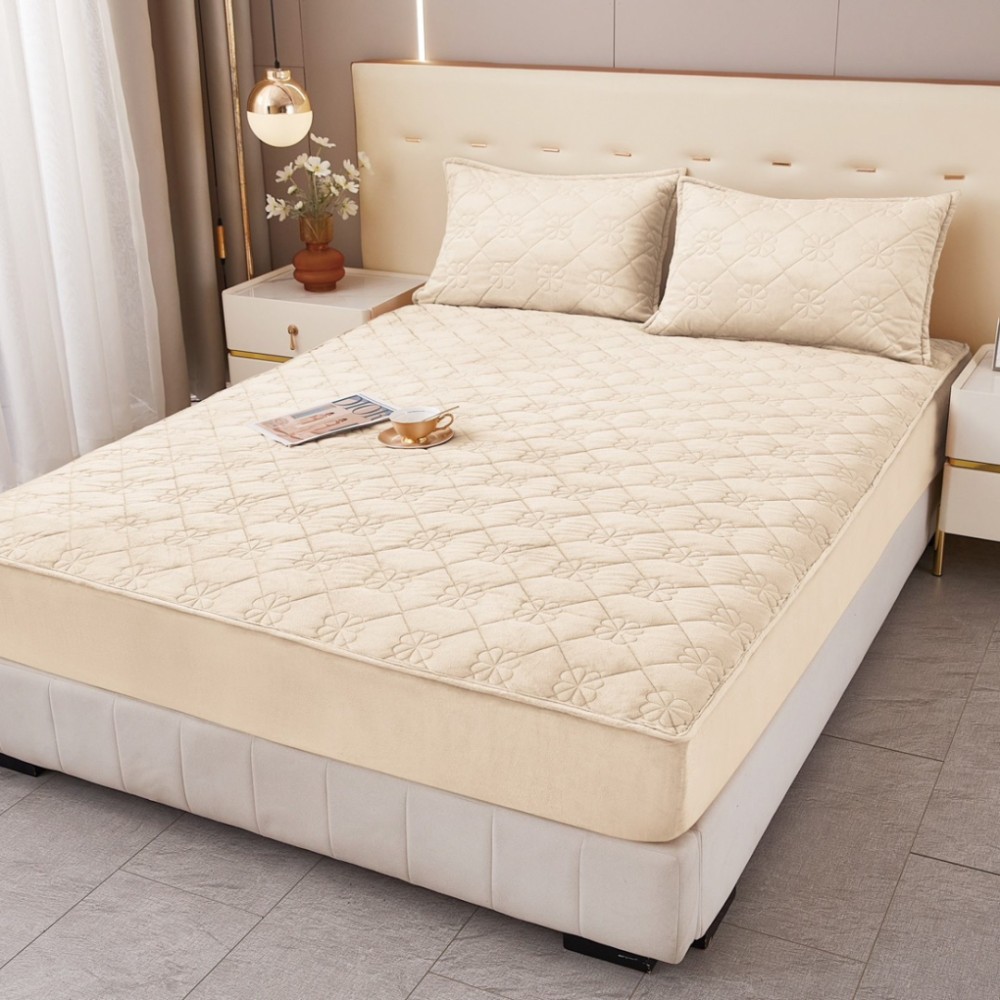 Husă Matlasată Tip Topper din Catifea 180x200cm, cu 2 Fețe de Pernă 50x70cm - Somn Odihnitor și Susținere pentru Spate, Crem, Veluxio Home, cod produs: ELN-TP180-12