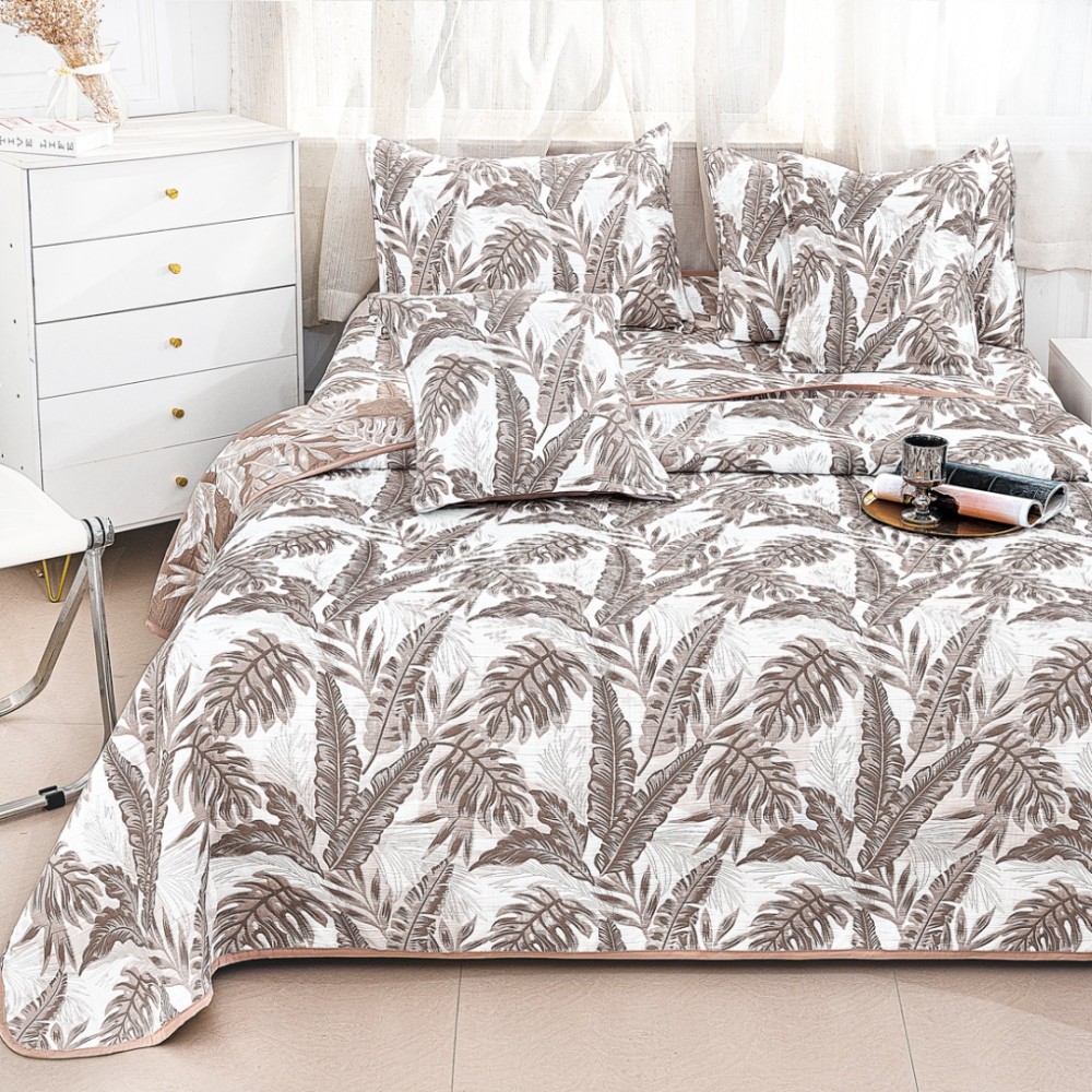 Cuvertură Pat Dublu, Bumbac cu In, Model Brodat Direct în Tesătură, 230x250 cm, 2 fete de perna 52x72cm, 2 fete de perna 46x46cm, Alb, Bej, Frunze, Casa Minunata, cod produs: INS-CVY14