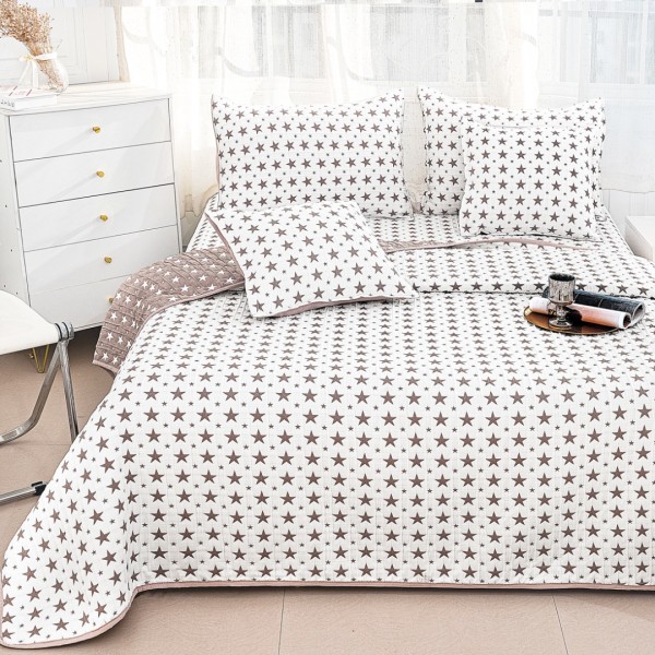 Cuvertură Pat Dublu, Bumbac cu In, Model Brodat Direct în Tesătură, 230x250 cm, 2 fete de perna 52x72cm, 2 fete de perna 46x46cm, Alb, Maro, Stelute, Casa Minunata, cod produs: INS-CVY17