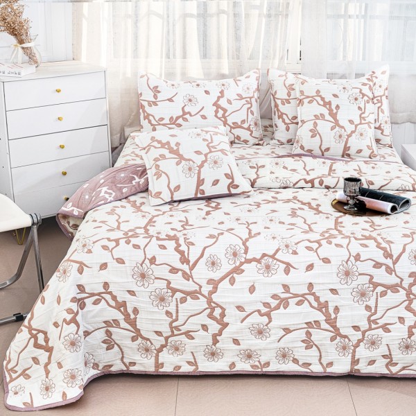 Cuvertură Pat Dublu, Bumbac cu In, Model Brodat Direct în Tesătură, 230x250 cm, 2 fete de perna 52x72cm, 2 fete de perna 46x46cm, Alb, Roz, Crenguțe cu Flori, Casa Minunata, cod produs: INS-CVY23