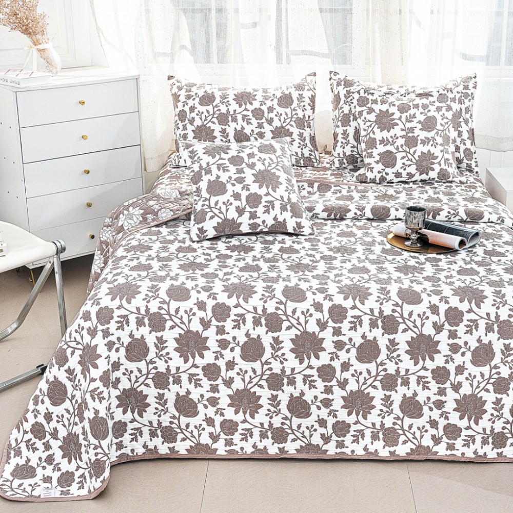 Cuvertură Pat Dublu, Bumbac cu In, Model Brodat Direct în Tesătură, 230x250 cm, 2 fete de perna 52x72cm, 2 fete de perna 46x46cm, Alb, Maro, Flori, Casa Minunata, cod produs: INS-CVY24