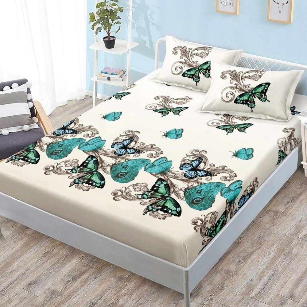 Cearsaf cu elastic, FINET, 180x200cm, 2 fete de perne 50x70cm, Crem, Verde, Fluturi, Johny Home Pucioasa, cod produs: SPR-G-248
