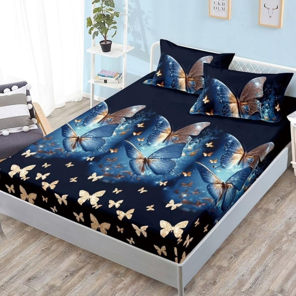 Cearșaf cu Elastic, Bumbac Satinat, 180x200 cm + 2 Fețe de Pernă 50x70 cm, Negru, Fluturi, Casa Minunata, cod produs: SPR-J-23