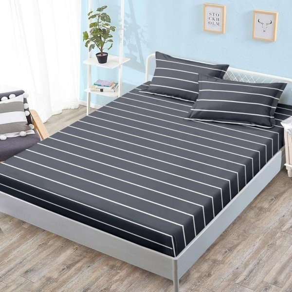 Cearșaf cu Elastic, Bumbac Satinat, 180x200 cm + 2 Fețe de Pernă 50x70 cm, Gri inchis, Dungi, Casa Minunata, cod produs: SPR-J-49