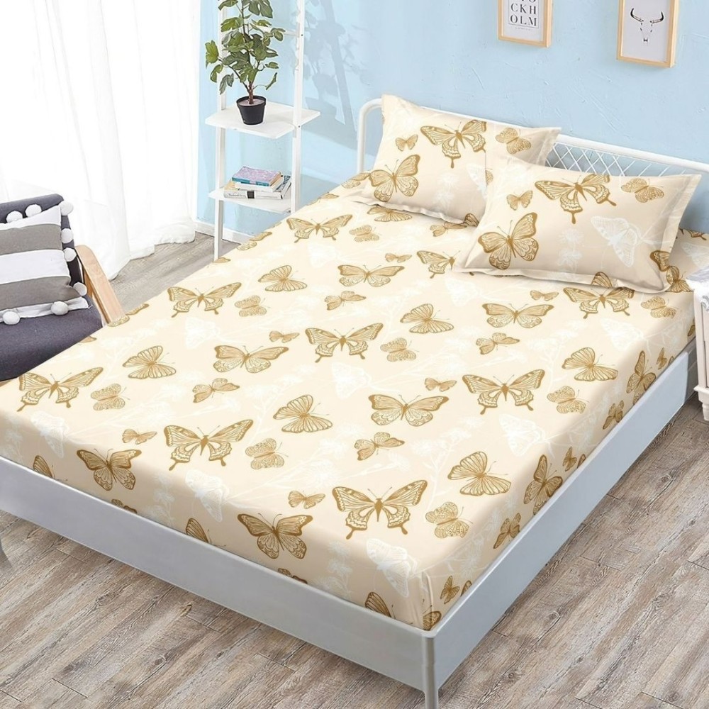 Cearșaf cu Elastic, Bumbac Satinat, 180x200 cm + 2 Fețe de Pernă 50x70 cm, Crem, Fluturi, Casa Minunata, cod produs: SPR-J-16