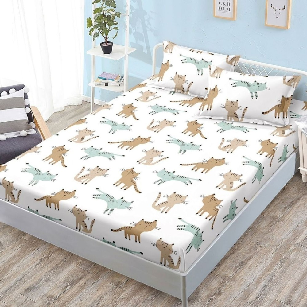 Cearșaf cu Elastic, Bumbac Satinat, 180x200 cm + 2 Fețe de Pernă 50x70 cm, Alb, Pisici, Casa Minunata, cod produs: SPR-J-19