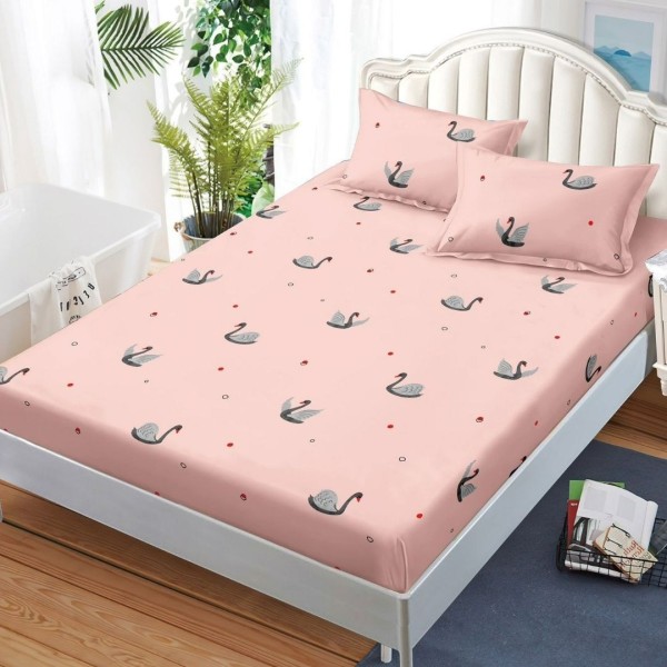Cearșaf cu Elastic, Bumbac Satinat, 180x200 cm + 2 Fețe de Pernă 50x70 cm, Roz, Lebede, Casa Minunata, cod produs: SPR-J-17