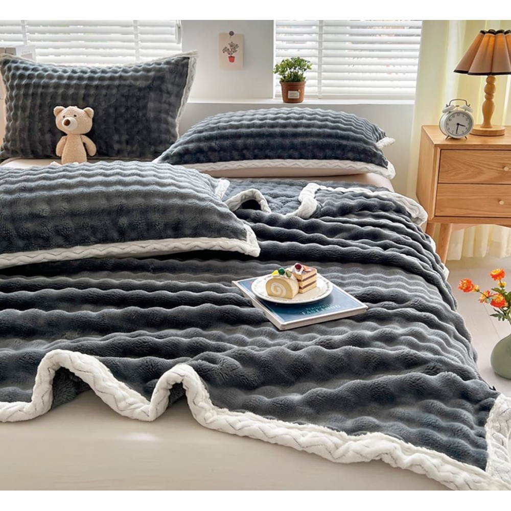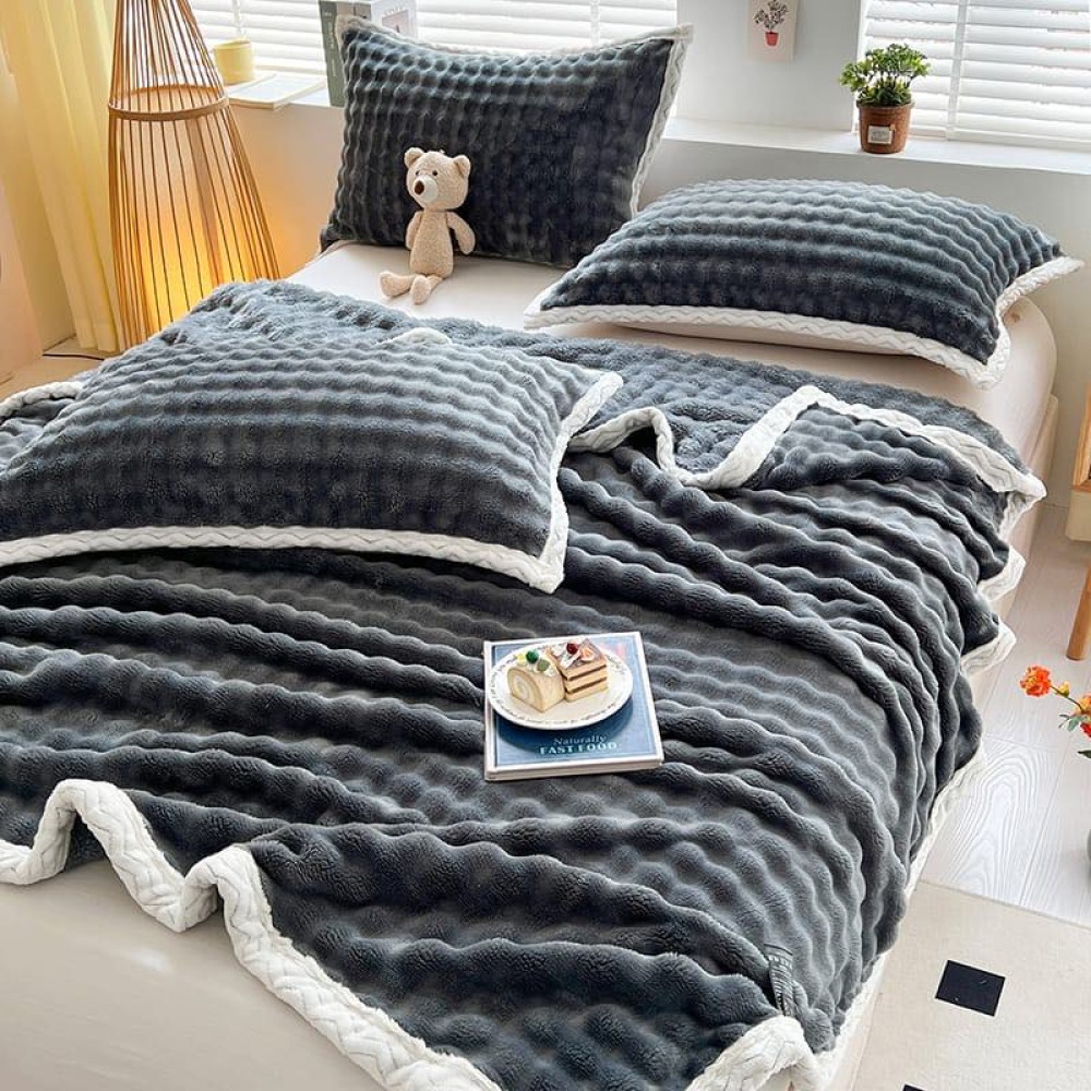 Pătură Premium, Blăniță Artificială Fină, 200x230cm + 2 Fețe de Pernă 52x78cm, cu Bordură din Blăniță Contrastantă – Confort și Eleganță în Fiecare Detaliu, Antracit, cod produs: INS-PBF05
