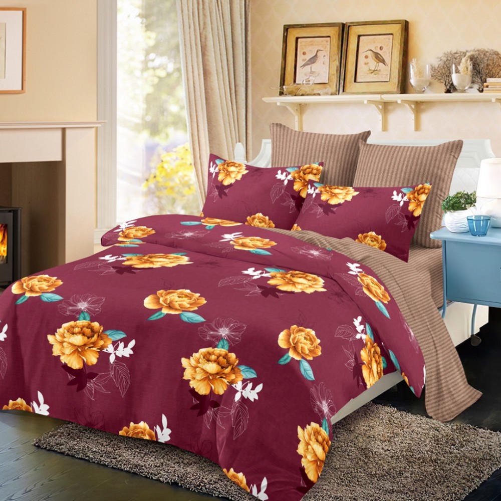 Lenjerie pat dublu, FINET, cu elastic, 6 piese, Vișiniu, Maro, Flori, Super Design Pucioasa, cod produs: SDP-FEB-554