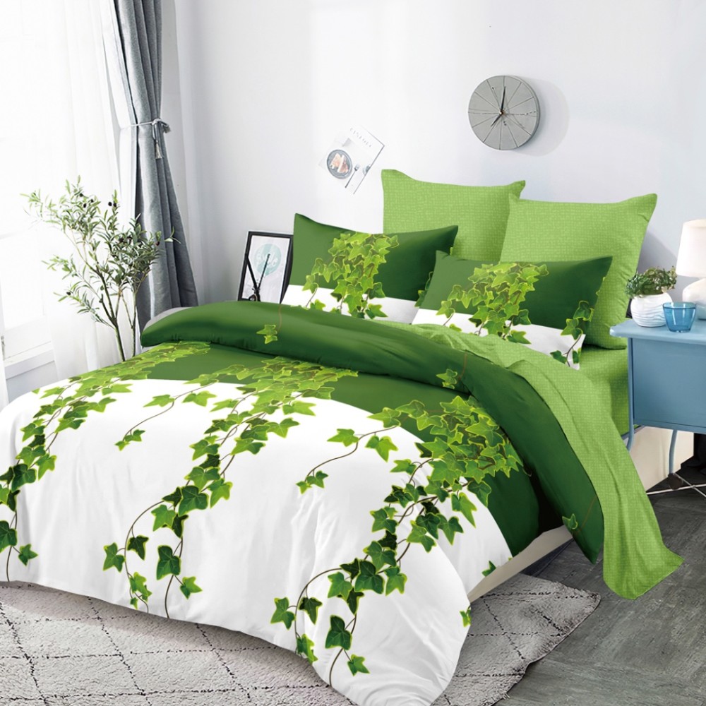 Lenjerie pat dublu, FINET, cu elastic, 6 piese, Alb, Verde, Frunze, Super Design Pucioasa, cod produs: SDP-FEB-603