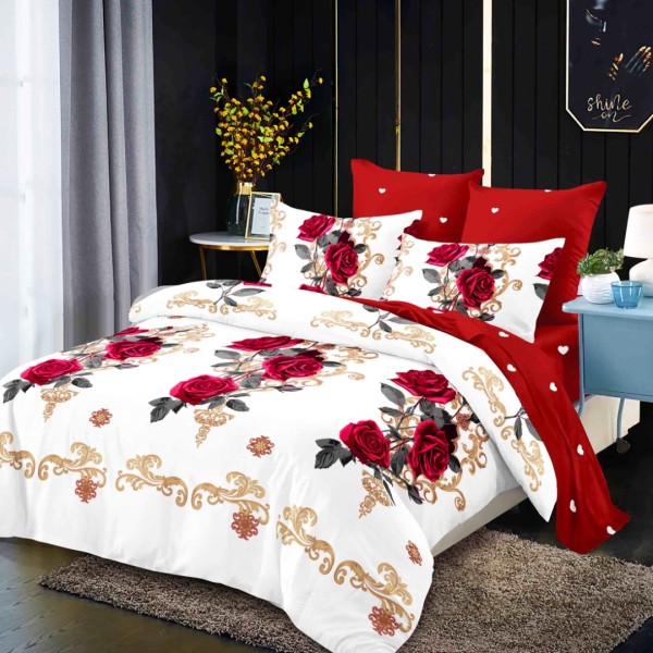 Lenjerie pat dublu, FINET, cu elastic, 6 piese, Alb, Rosu, Flori, Super Design Pucioasa, cod produs: SDP-FEB-609