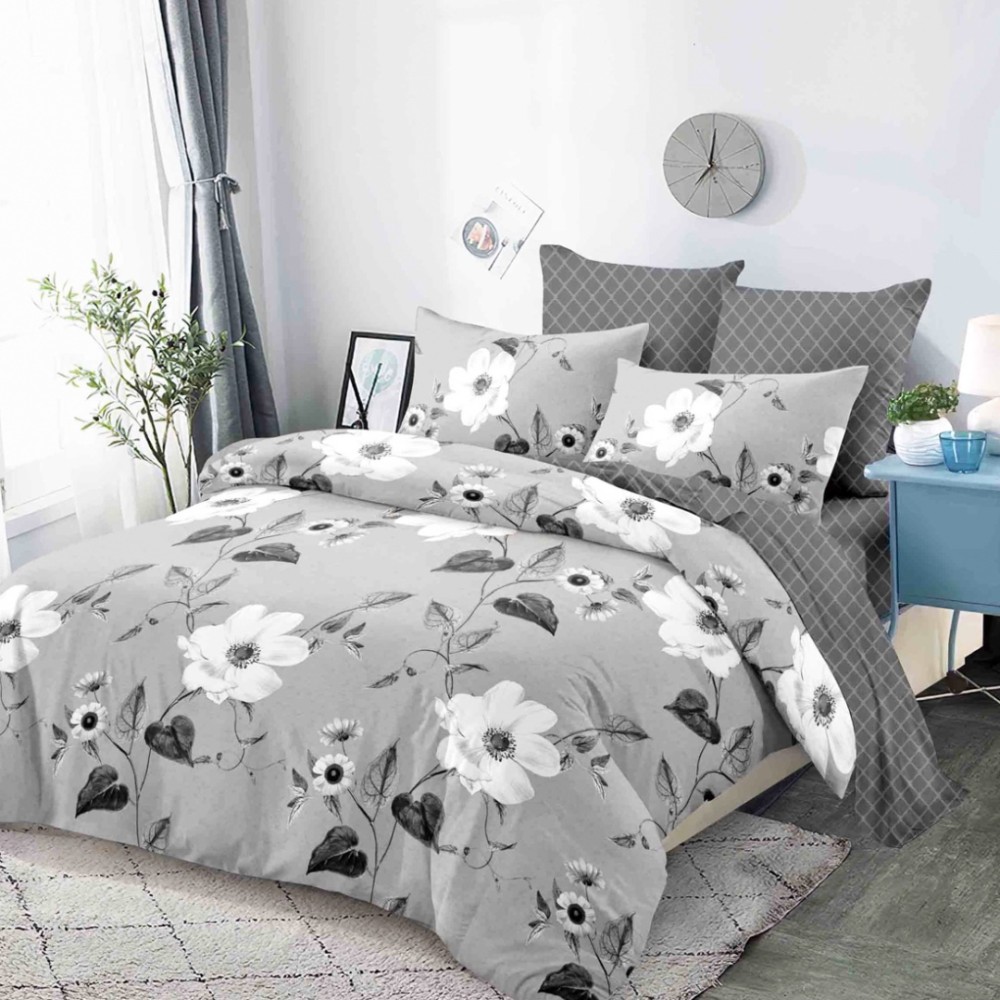 Lenjerie pat dublu, FINET, cu elastic, 6 piese, Gri, Flori, Super Design Pucioasa, cod produs: SDP-FEB-610