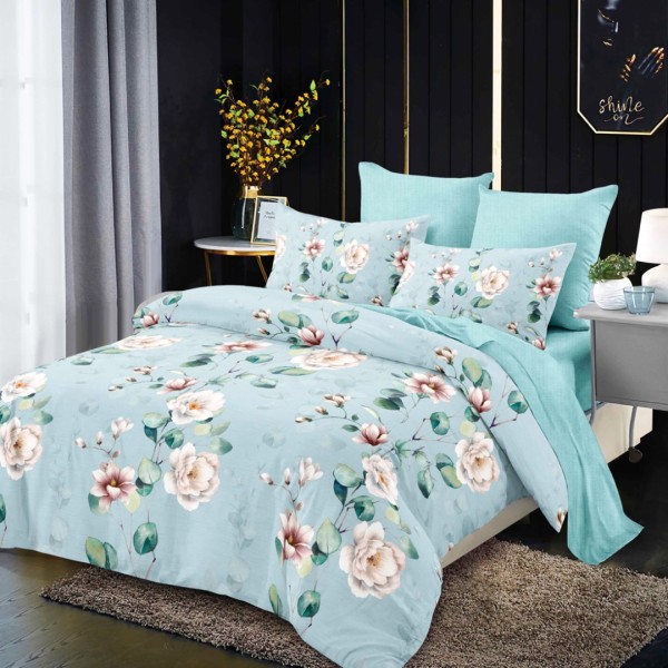 Lenjerie pat dublu, FINET, cu elastic, 6 piese, Bleu, Flori, Super Design Pucioasa, cod produs: SDP-FEB-681