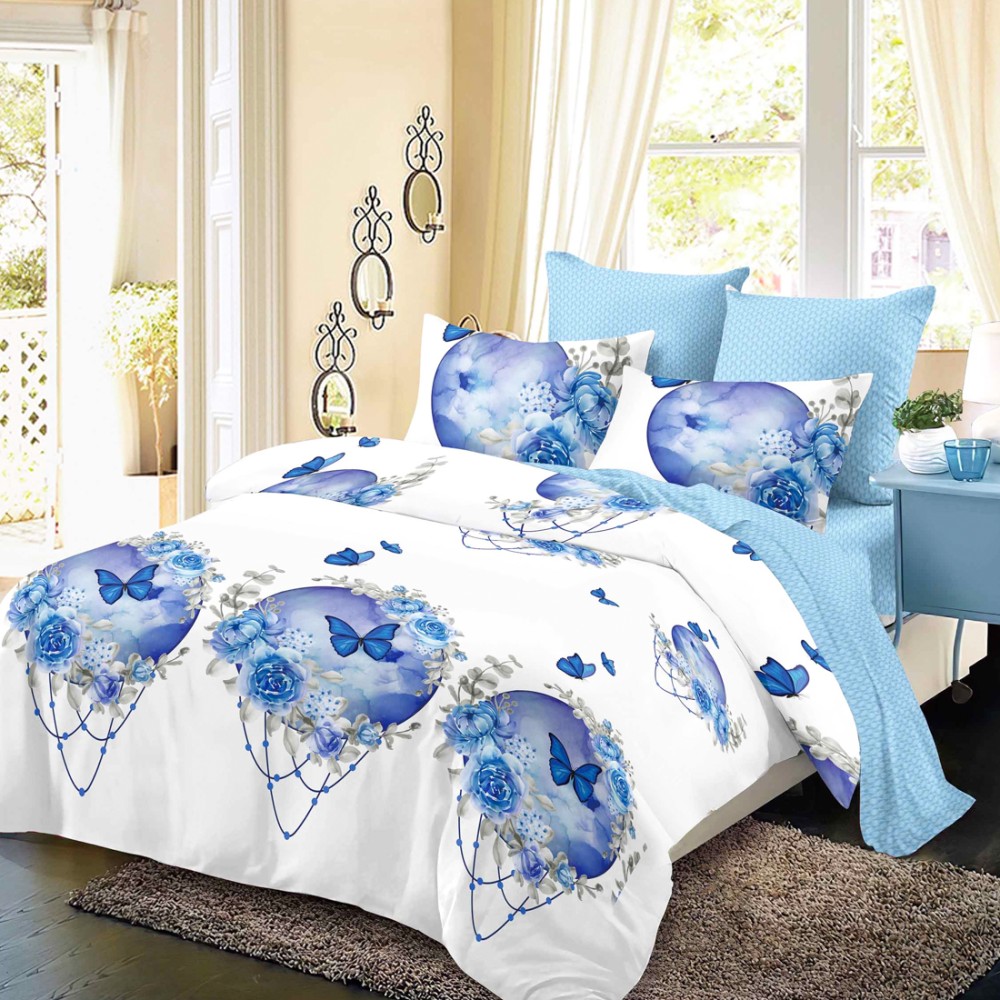 Lenjerie Pat Dublu, FINET, 6 piese, Alb, Albastru, Flori, Fluturi, Super Design Pucioasa, cod produs: SDP-FNC-684