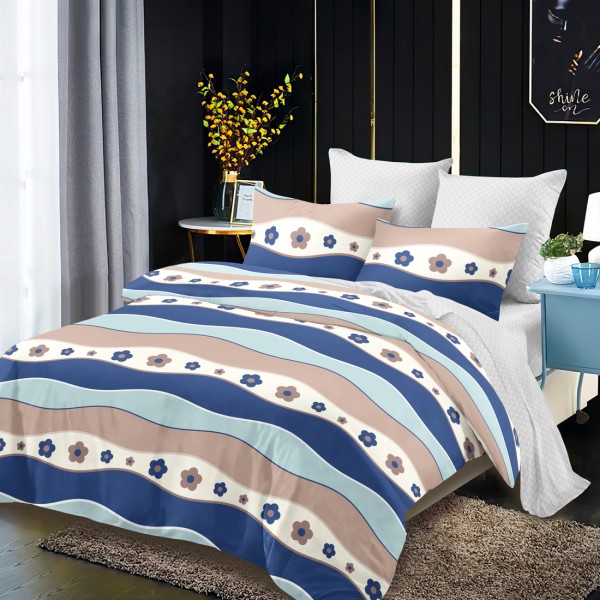 Lenjerie Pat Dublu, FINET, 6 piese, Albastru, Bej, Dungi, Flori, Super Design Pucioasa, cod produs: SDP-FNC-747
