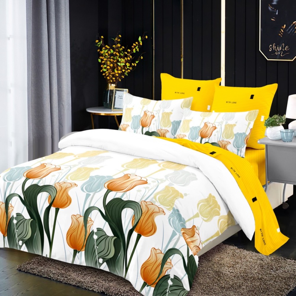 Lenjerie Pat Dublu, FINET, 6 piese, Alb, Galben, Flori, Super Design Pucioasa, cod produs: SDP-FNC-751
