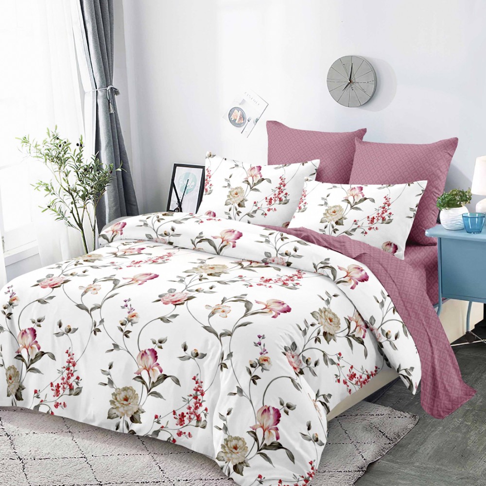 Lenjerie Pat Dublu, FINET, 6 piese, Alb, Roz, Flori, Super Design Pucioasa, cod produs: SDP-FNC-823