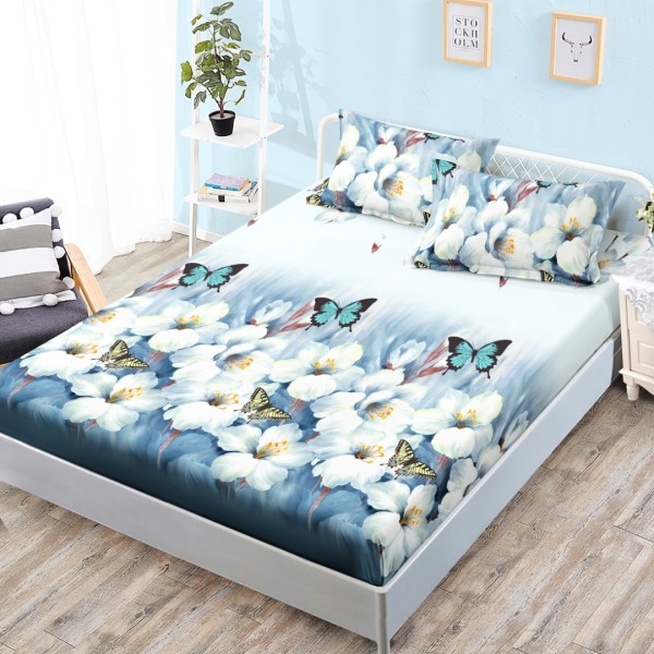 Cearsaf cu elastic, Bumbac FINET, 160x200cm, 2 fete de perne 50x70cm, Bleu, Flori, Fluturi, Super Design Pucioasa, cod produs: SDP-HH-70