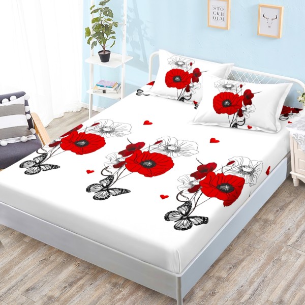 Cearsaf cu elastic, Bumbac FINET, 160x200cm, 2 fete de perne 50x70cm, Alb, Rosu, Maci, Fluturi, Super Design Pucioasa, cod produs: SDP-HH-104