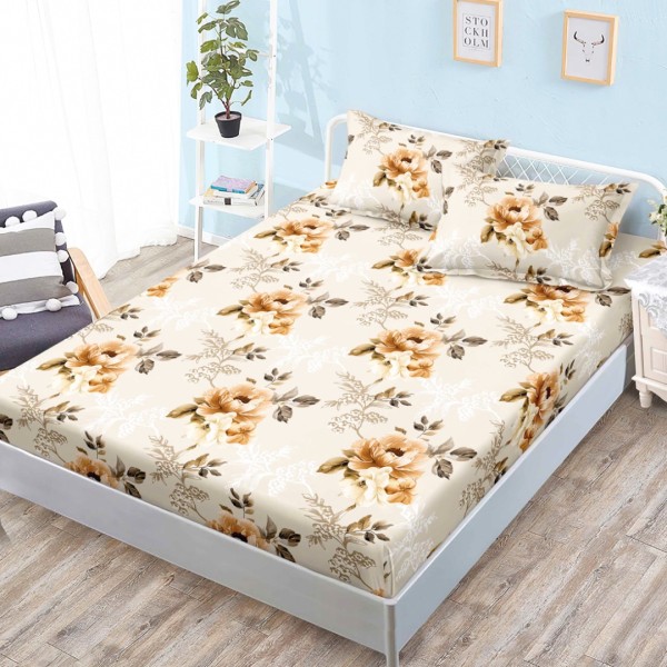 Cearsaf cu elastic, Bumbac FINET, 160x200cm, 2 fete de perne 50x70cm, Bej, Flori, Super Design Pucioasa, cod produs: SDP-HH-131