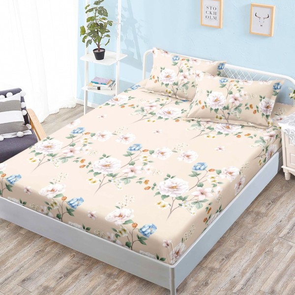 Cearsaf cu elastic, Bumbac FINET, 160x200cm, 2 fete de perne 50x70cm, Bej, Flori, Super Design Pucioasa, cod produs: SDP-HH-135