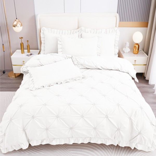 Lenjerie de Pat Premium, Bumbac Finet, Pliuri Brodate cu Volanase, 4 Piese, Nesifonabilă și Durabilă, Alb, Super Design Pucioasa, cod produs: SDP-PBP-01