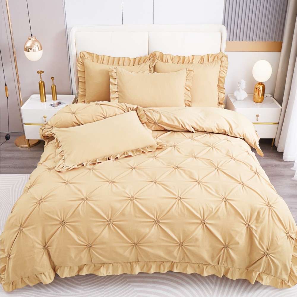 Lenjerie de Pat Premium, Bumbac Finet, Pliuri Brodate cu Volanase, 4 Piese, Nesifonabilă și Durabilă, Bej, Super Design Pucioasa, cod produs: SDP-PBP-05
