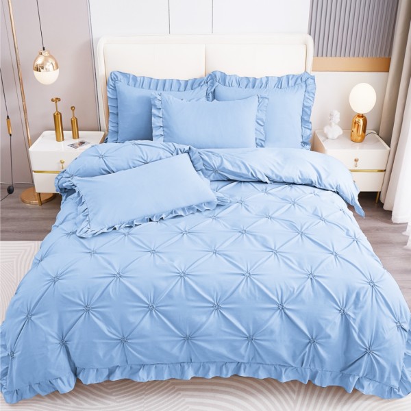 Lenjerie de Pat Premium, Bumbac Finet, Pliuri Brodate cu Volanase, 4 Piese, Nesifonabilă și Durabilă, Bleu, Super Design Pucioasa, cod produs: SDP-PBP-09