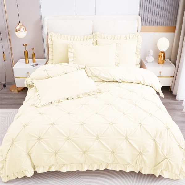 Lenjerie de Pat Premium din Bumbac Finet cu Pliuri Brodate si Volanase – Eleganță Incomparabilă, Confort Absolut și Întreținere Fără Griji