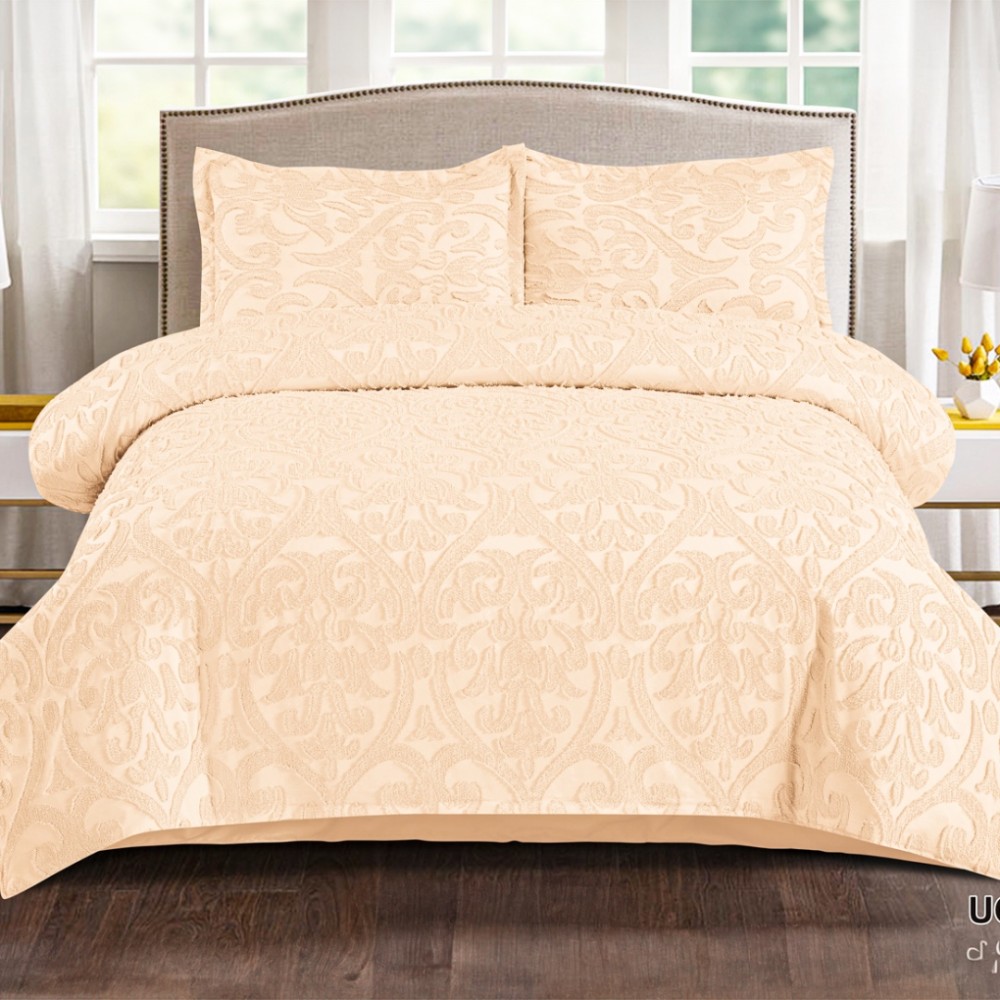 Transformă dormitorul într-un spațiu de lux cu noua lenjerie de pat dublu din finet de bumbac 100%, cu smocuri brodate în relief – o țesătură revoluționară care combină rafinamentul cu funcționalitatea, pentru un confort desăvârșit în fiecare noapte.