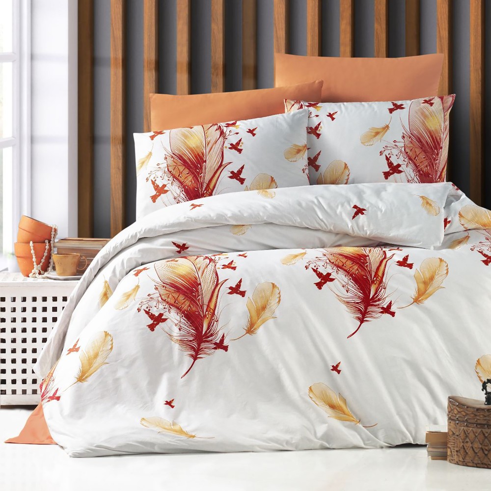Lenjerie de pat dublu, 4 piese, Bumbac 100% Ranforce, Ralex Pucioasa, pene , alb , portocaliu , cod produs: RXR18