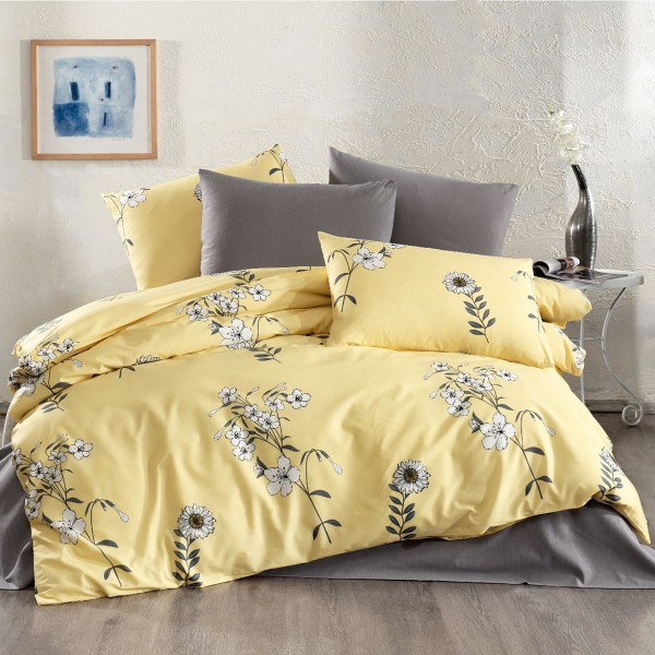 Lenjerie de pat dublu, 4 piese, Bumbac 100% Ranforce, Ralex Pucioasa, flori, galben, gri , cod produs: RXR23