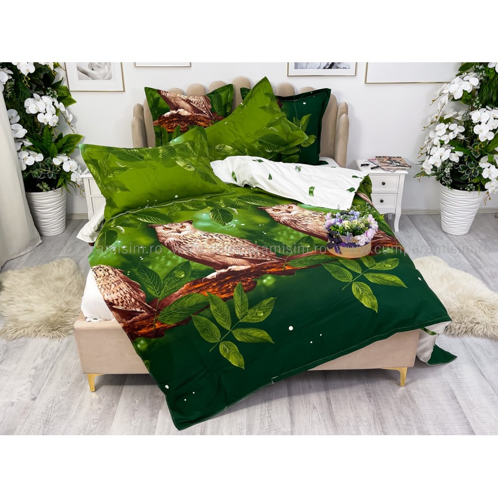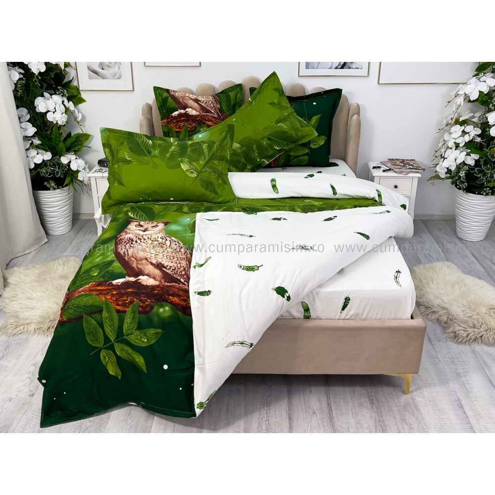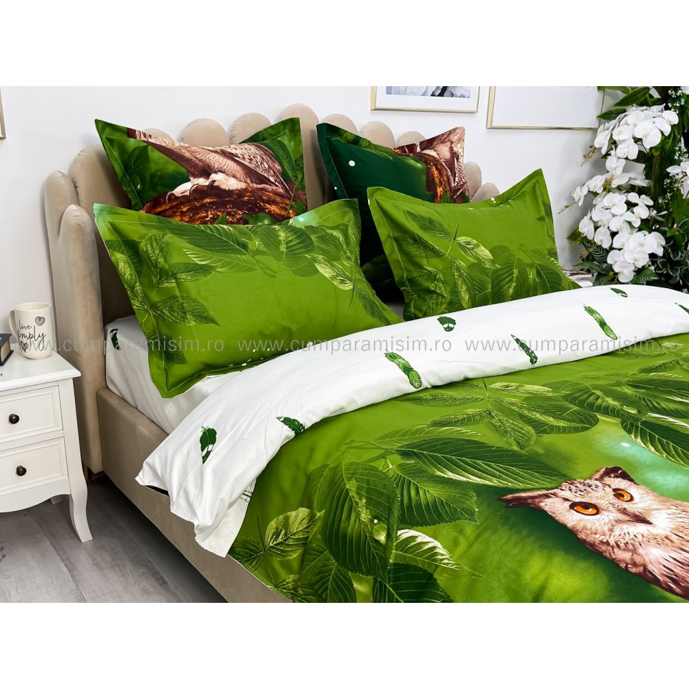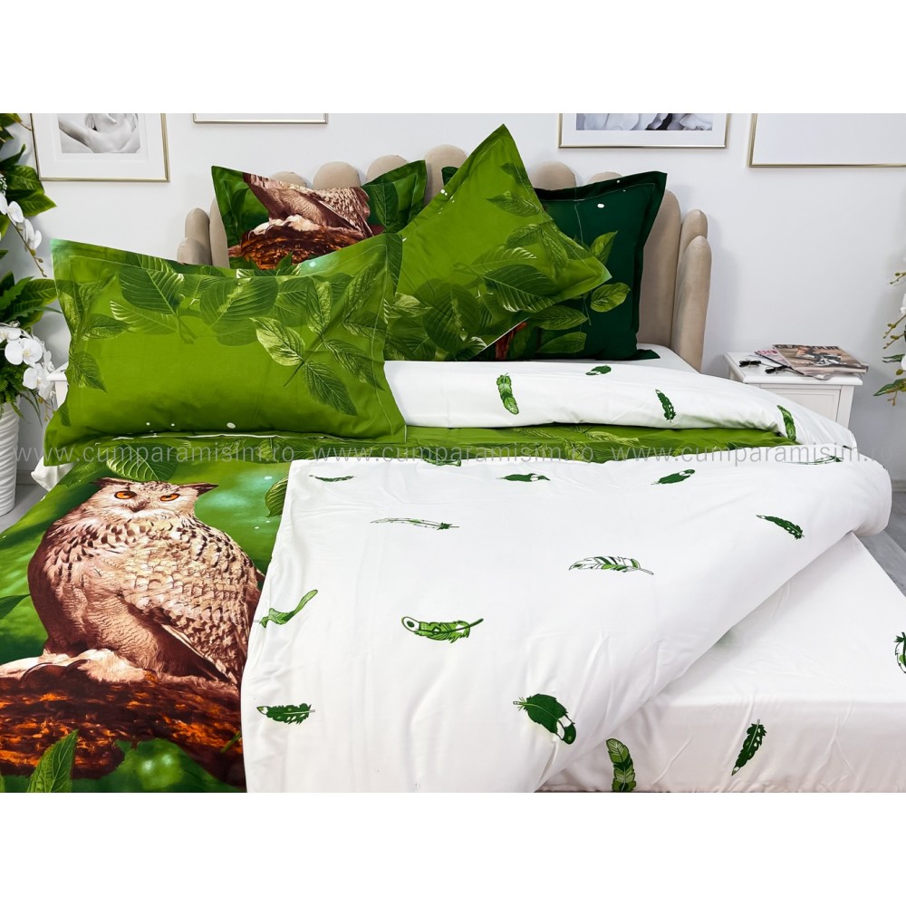 Lenjerie pat dublu, FINET, cu elastic, 6 piese, Verde, bufnite, Primavara Casa, cod produs: CFE75