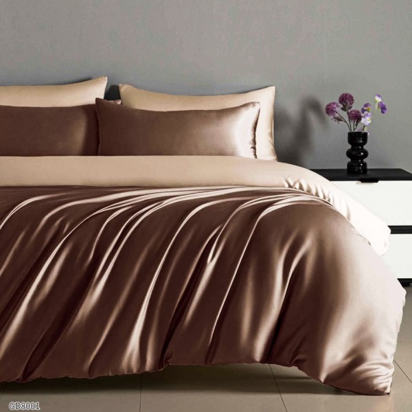 Lenjerie de Pat din Satin Extra Fin, Pat Dublu, 4 Piese, cu ELASTIC, Bicolor, Maro – Rafinament și Lux la Superlativ, Primavara Casa, cod produs: PRM-ST-GD8001