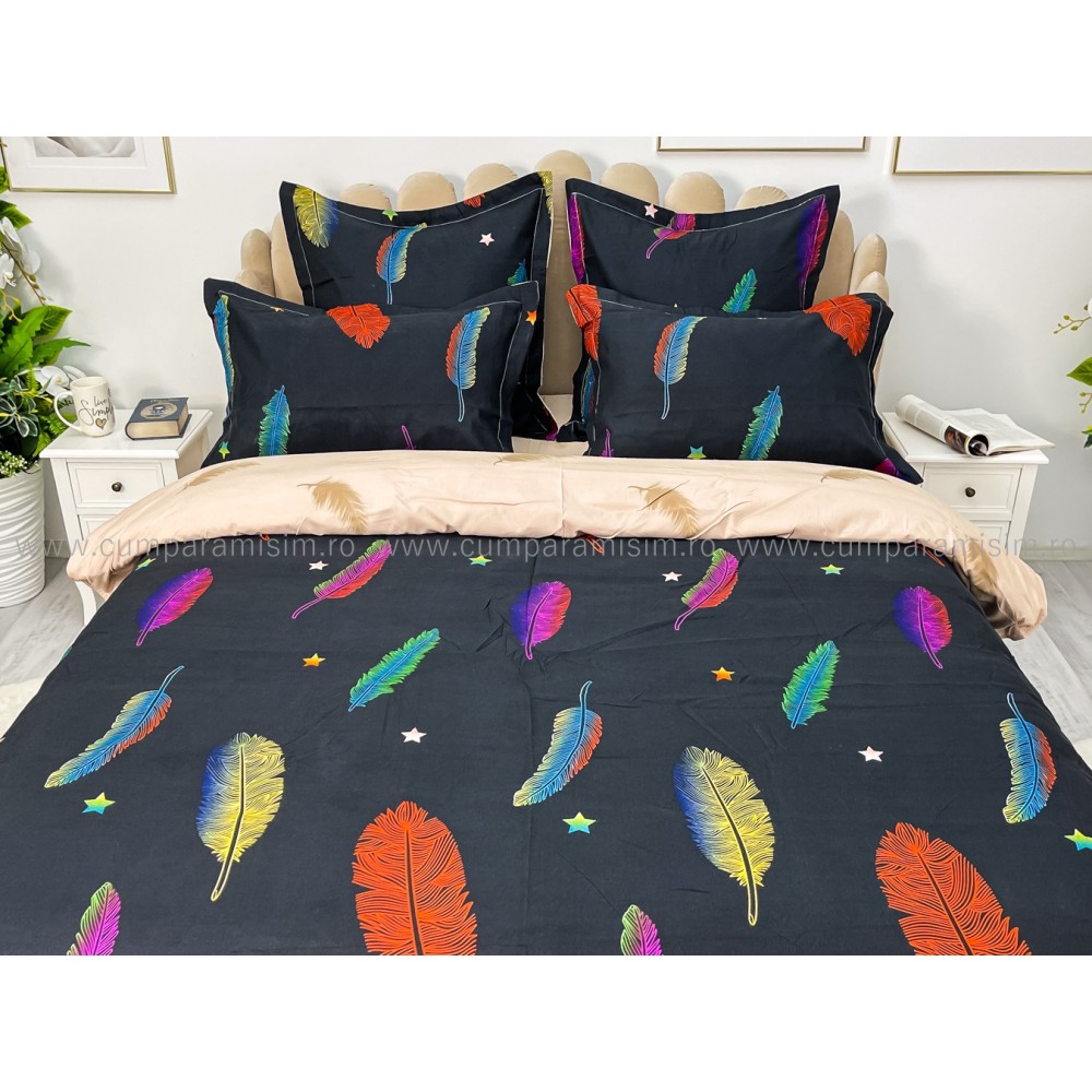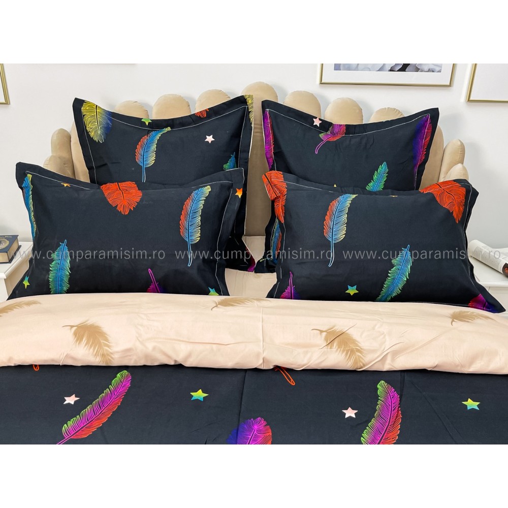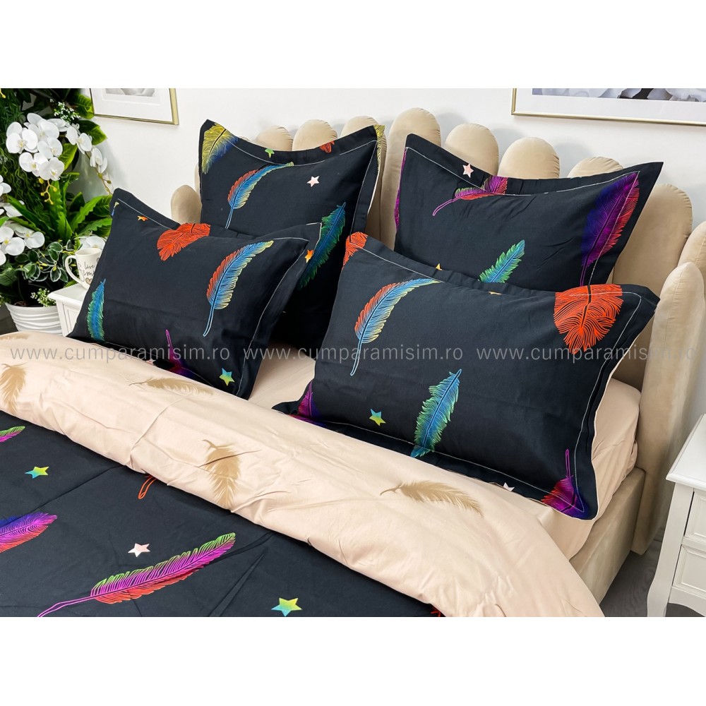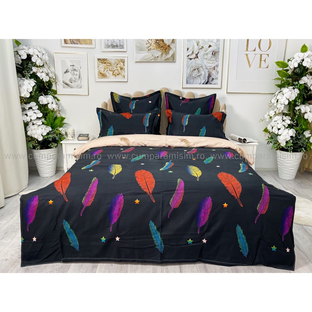 Lenjerie pat dublu, BUMBAC FINET, 6 piese, CU ELASTIC, Negru-Multicolor, pene, Primavara Casa, cod produs: PTK15