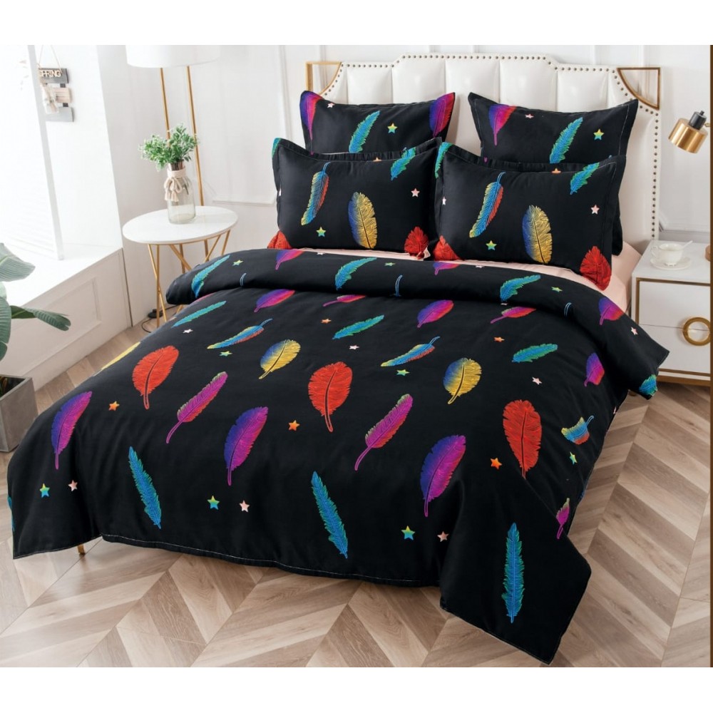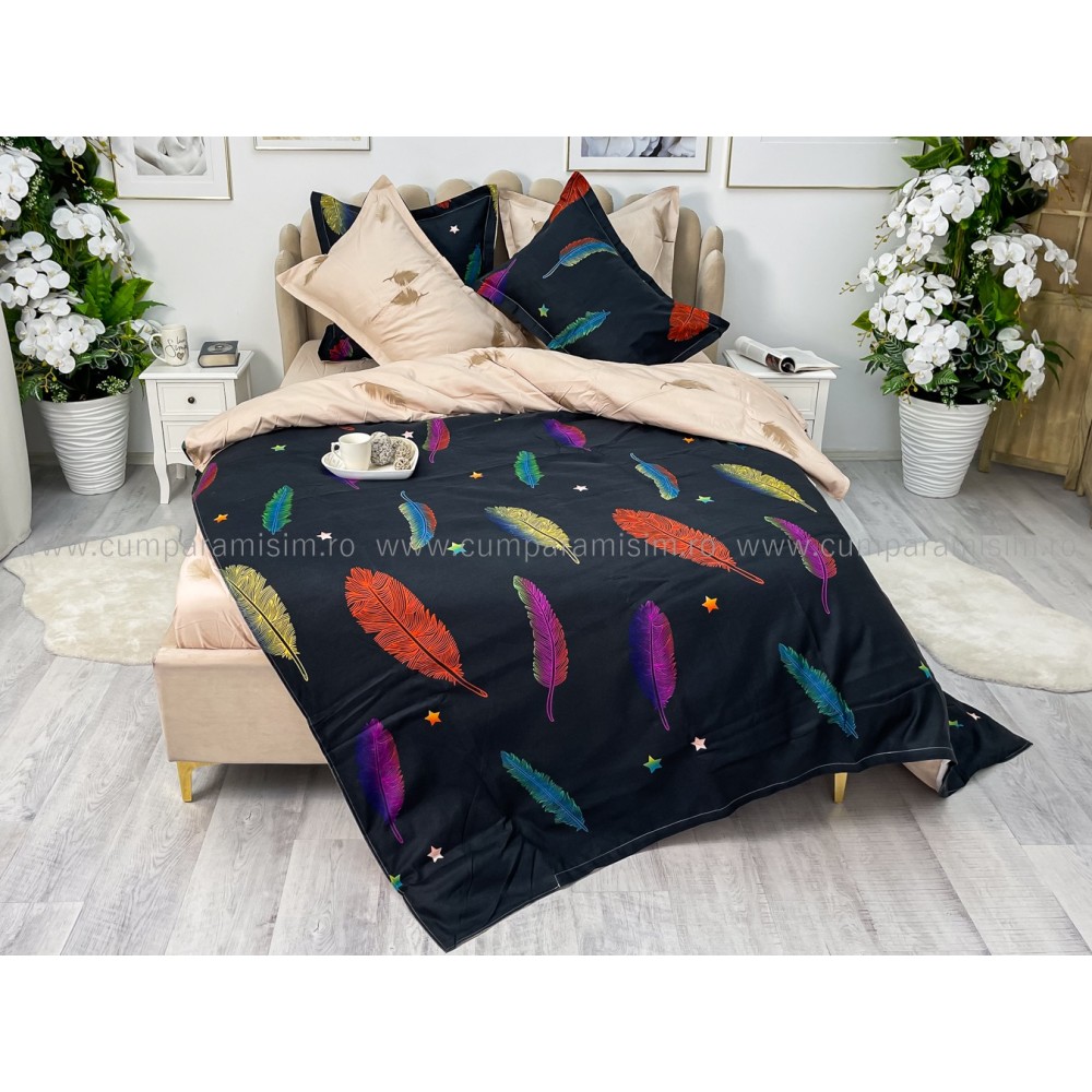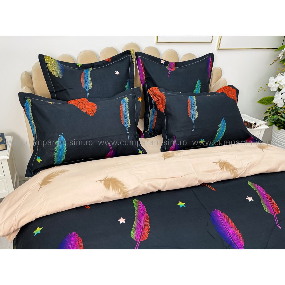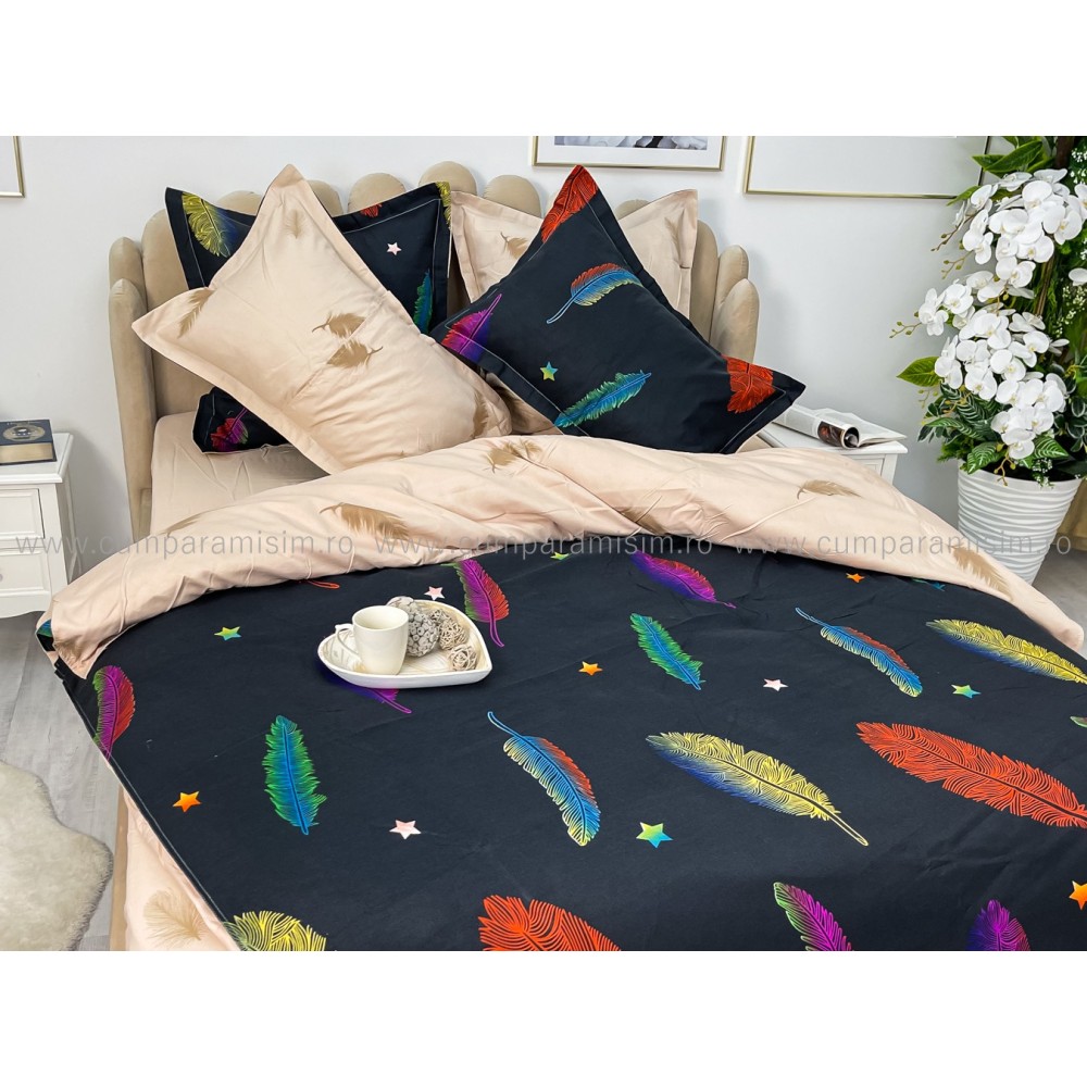 Lenjerie pat dublu, BUMBAC FINET, 6 piese, CU ELASTIC, Negru-Multicolor, pene, Primavara Casa, cod produs: PTK15