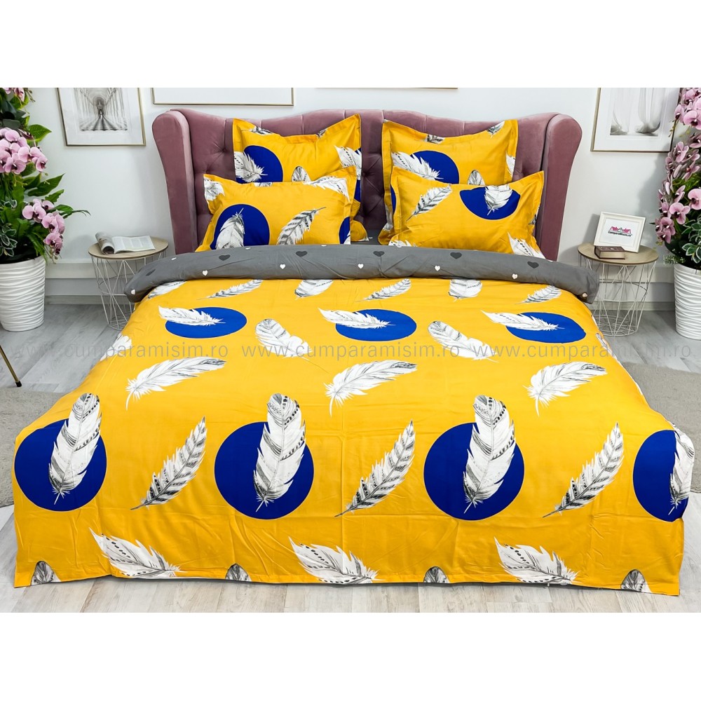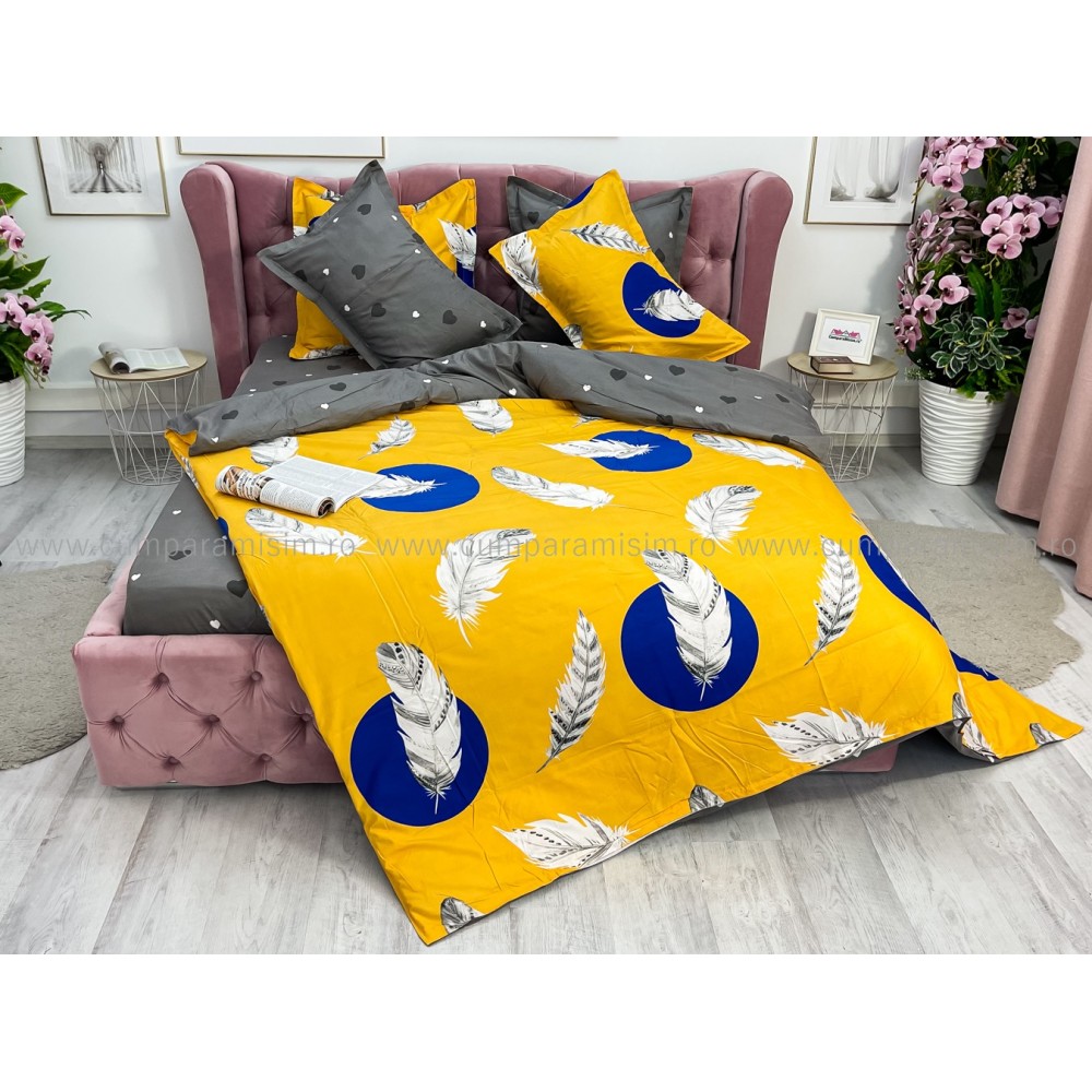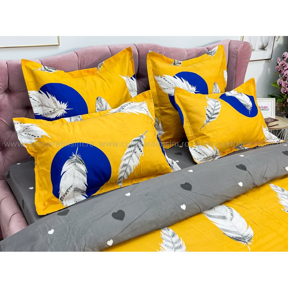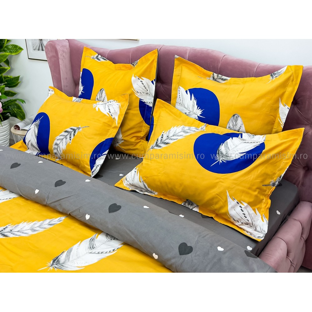 Lenjerie pat dublu, BUMBAC FINET, 6 piese, CU ELASTIC, Galben-Multicolor, pene, Primavara Casa, cod produs: PTK2