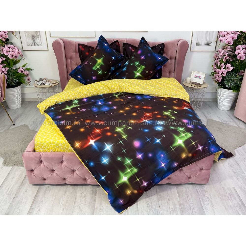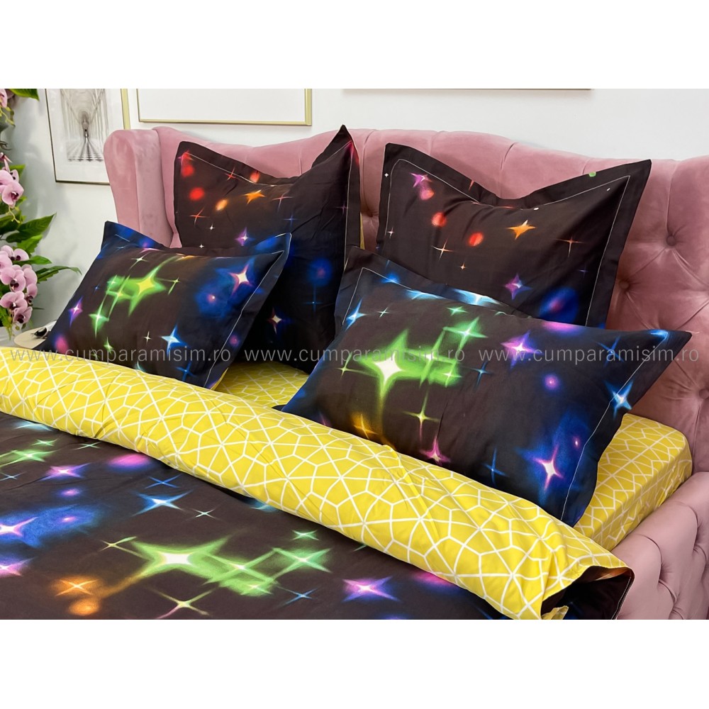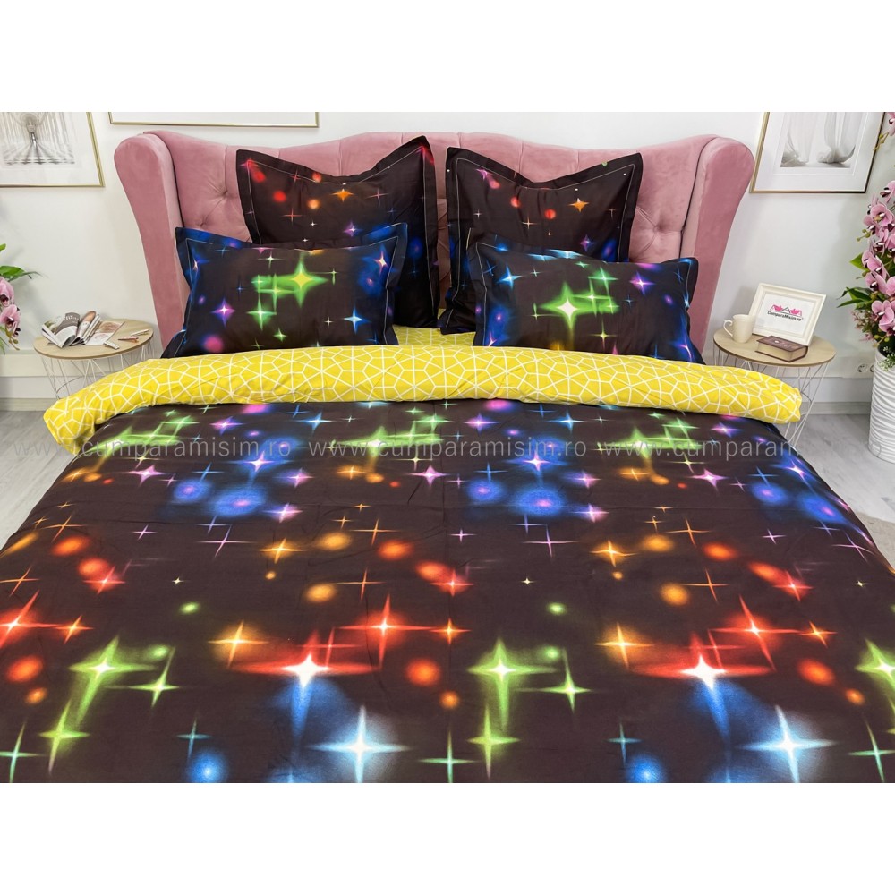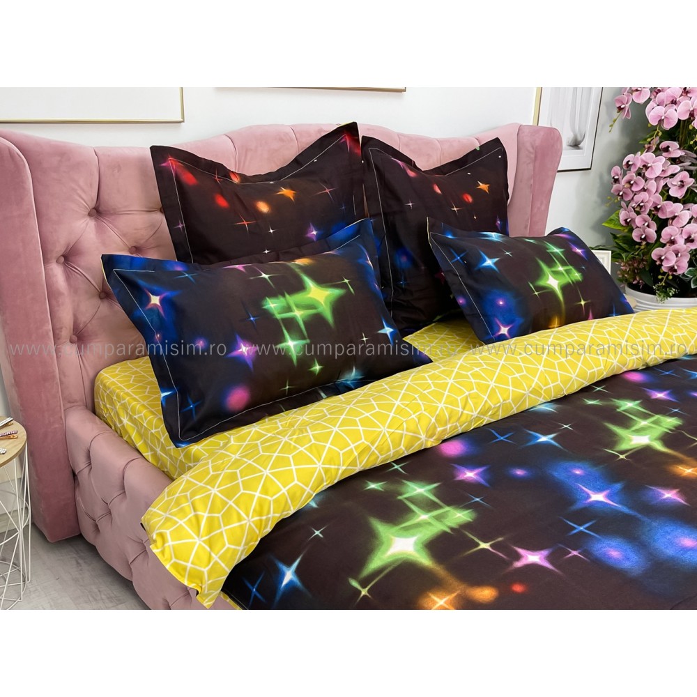Lenjerie pat dublu, BUMBAC FINET, 6 piese, CU ELASTIC, Negru-Multicolor, stelute, Primavara Casa, cod produs: PTK26