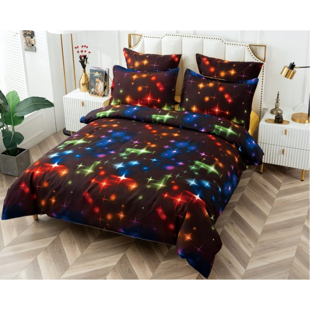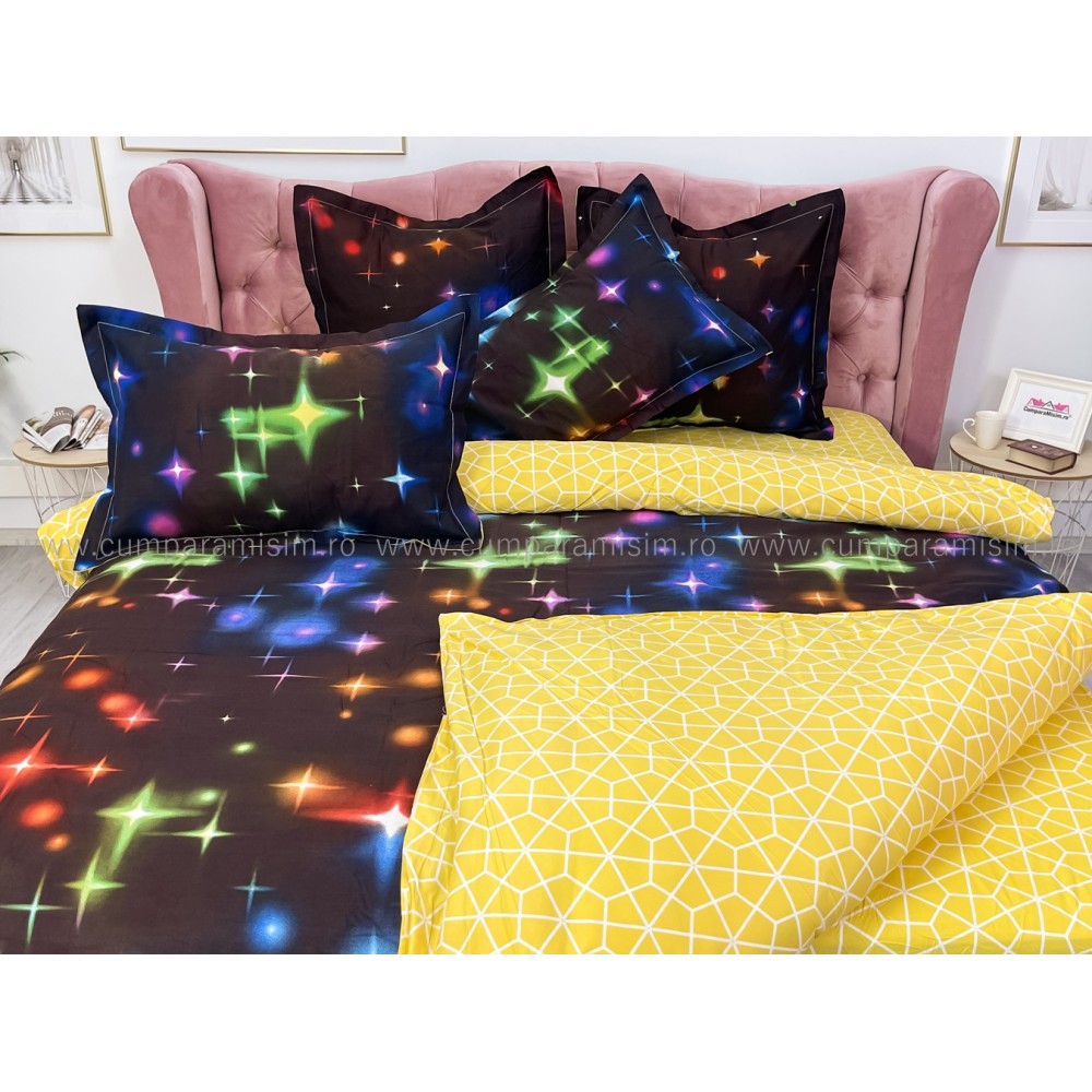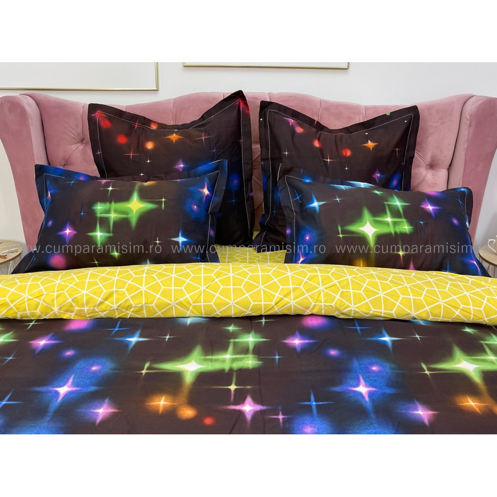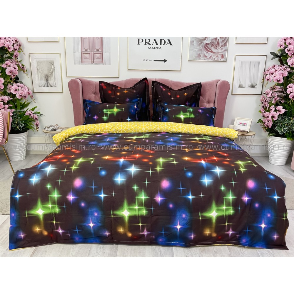 Lenjerie pat dublu, BUMBAC FINET, 6 piese, CU ELASTIC, Negru-Multicolor, stelute, Primavara Casa, cod produs: PTK26