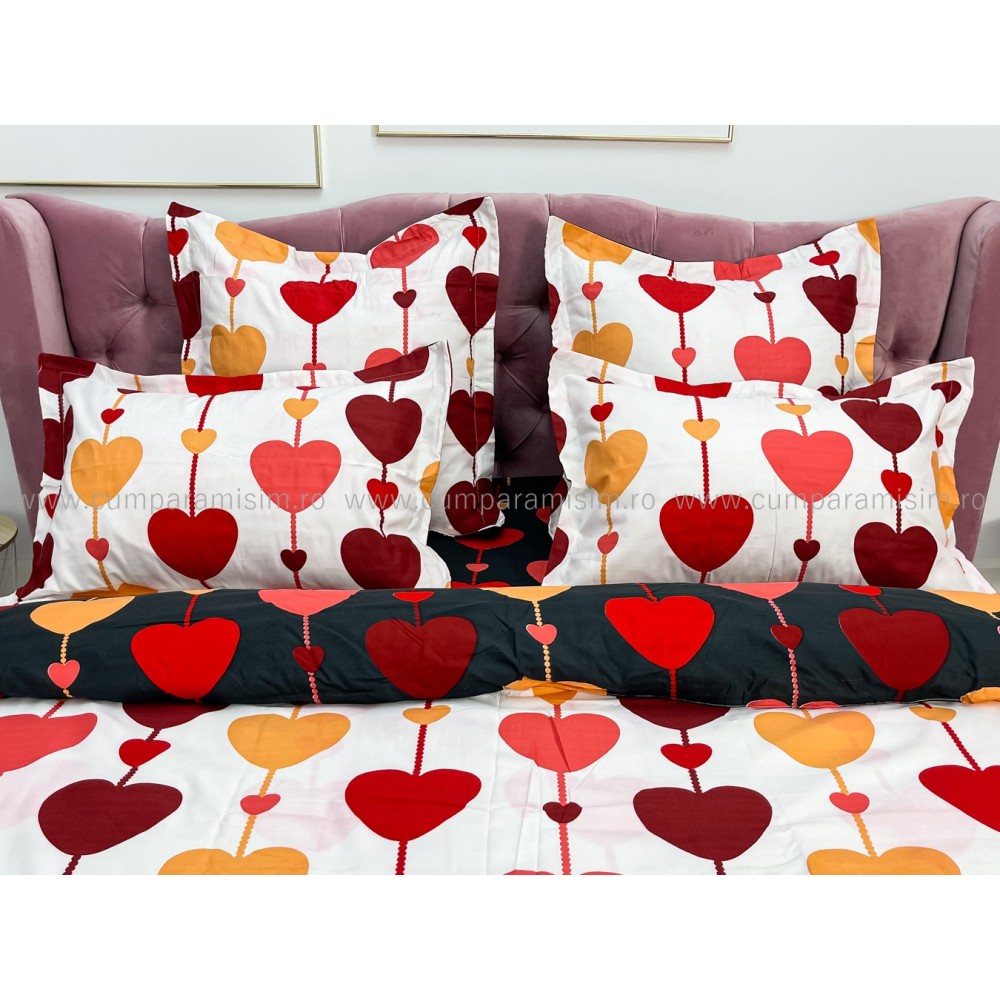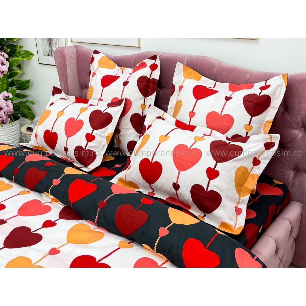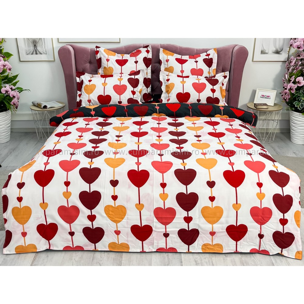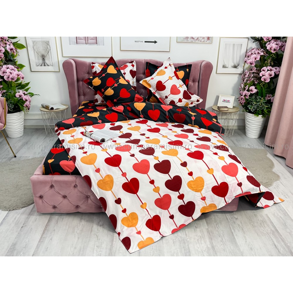 Lenjerie pat dublu, BUMBAC FINET, 6 piese, CU ELASTIC, Alb-Rosu, inimioare, Primavara Casa, cod produs: PTK7