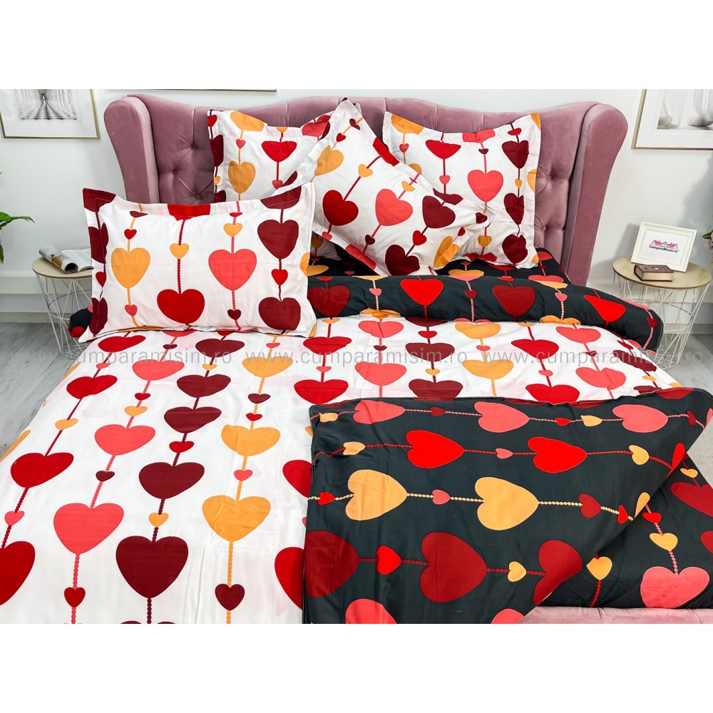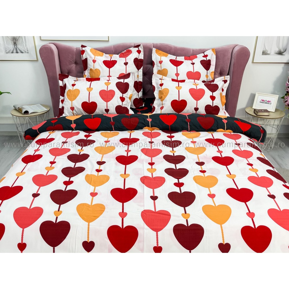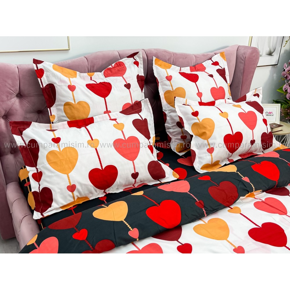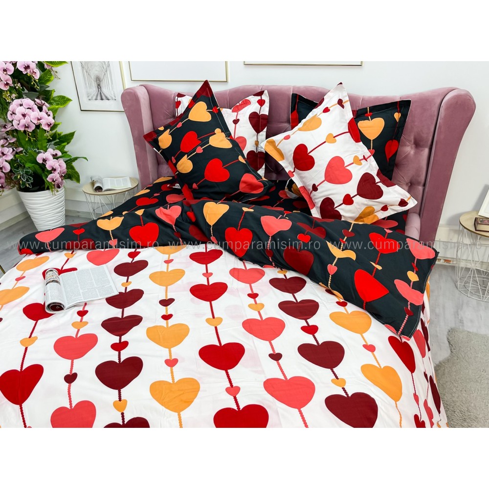 Lenjerie pat dublu, BUMBAC FINET, 6 piese, CU ELASTIC, Alb-Rosu, inimioare, Primavara Casa, cod produs: PTK7