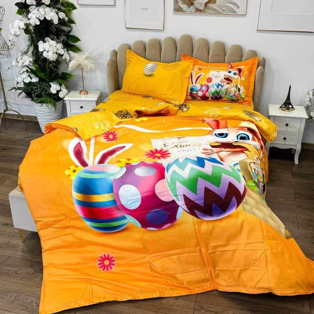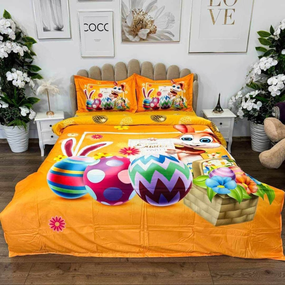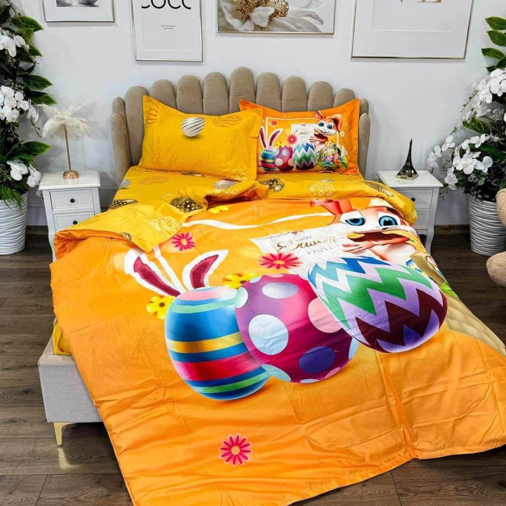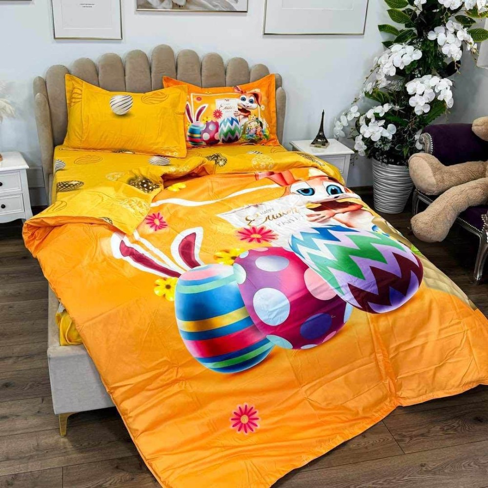 Lenjerie de Pat Dublu, Finet, Imprimeu Digital, 4 Piese, Galben Aprins, Oua Colorate, Iepuras, Super Design Pucioasa, cod produs: SDP-PF-16