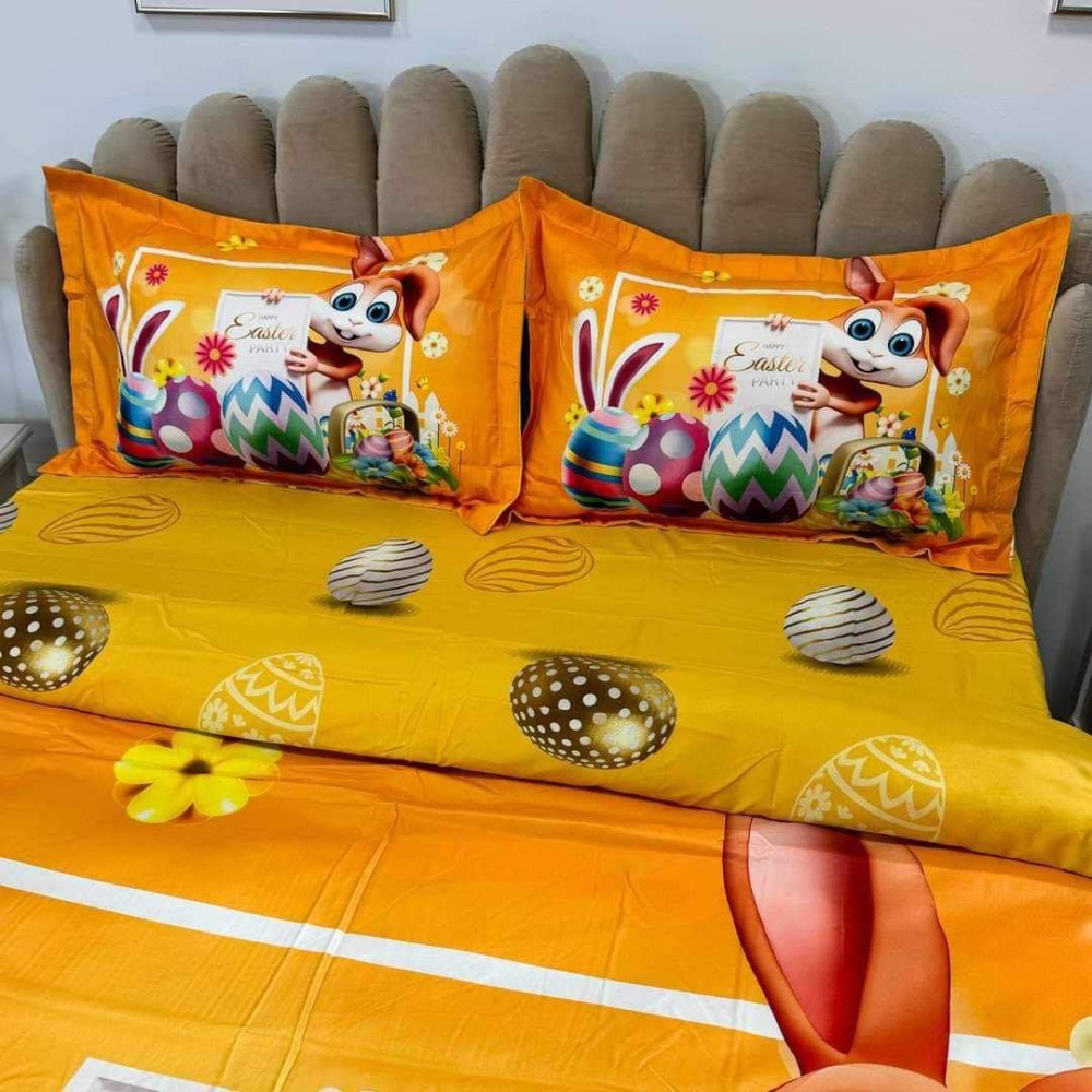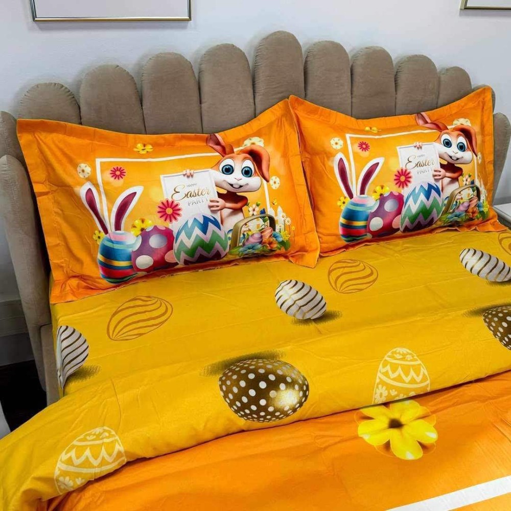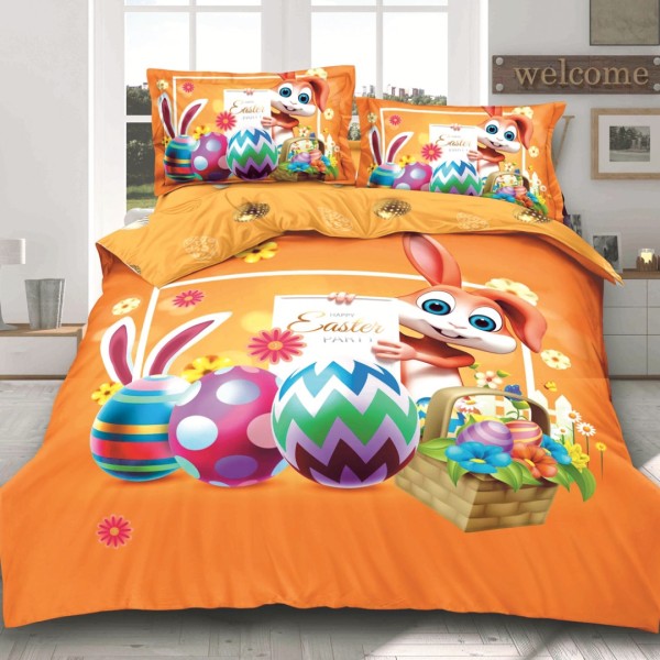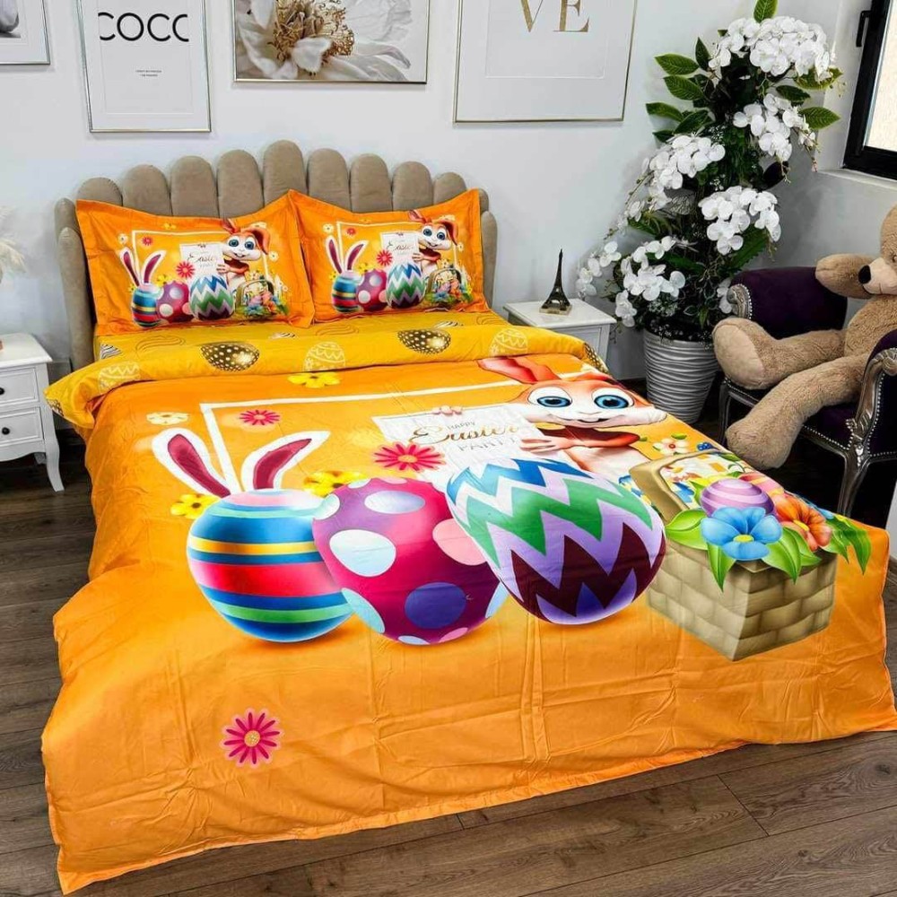 Lenjerie de Pat Dublu, Finet, Imprimeu Digital, 4 Piese, Galben Aprins, Oua Colorate, Iepuras, Super Design Pucioasa, cod produs: SDP-PF-16