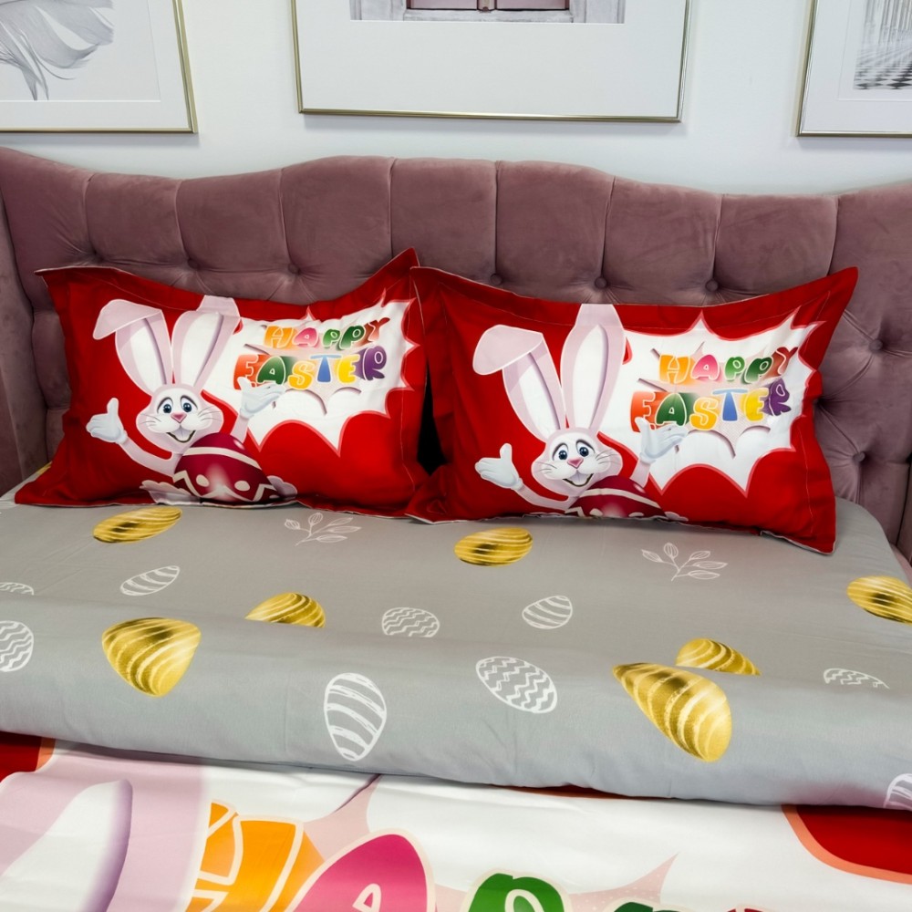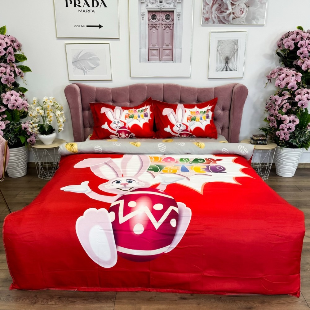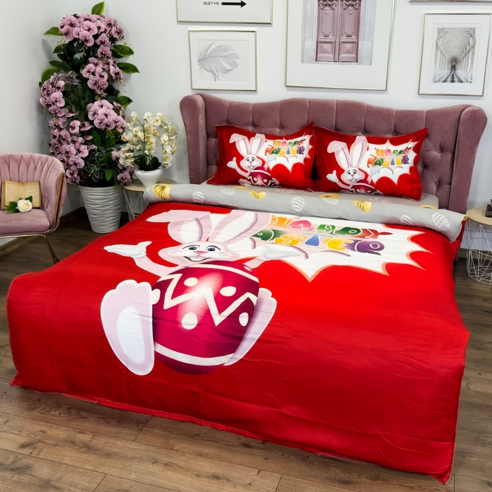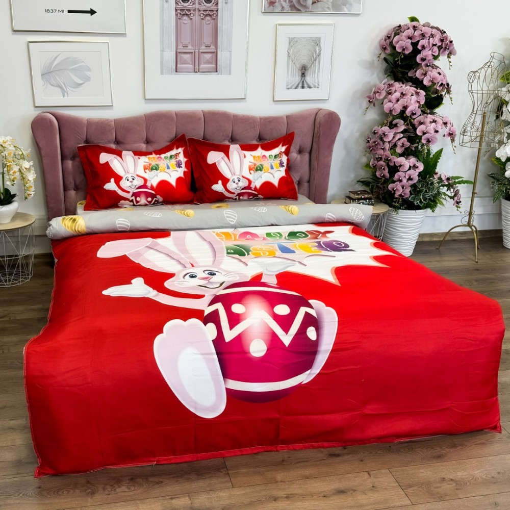 Lenjerie de Pat Dublu, Finet, Imprimeu Digital, 4 Piese, Roșu, Gri, Iepuraș, Happy Easter, Super Design Pucioasa, cod produs: SDP-PF-34